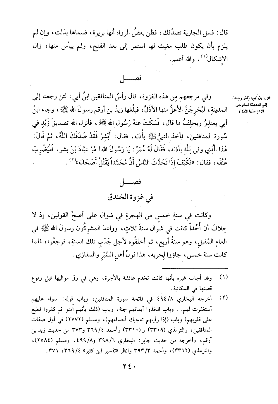 وَفِي مَرْجِعِهِمْ مِنْ هَذِهِ الْغَزْوَةِ ( «قَالَ رَأْسُ الْمُنَافِقِينَ ابن أبي: لَئِنْ رَجَعْنَا إِلَى الْمَدِينَةِ لَيُخْرِجَنَّ الْأَعَزُّ مِنْهَا الْأَذَلَّ، فَبَلَّغَهَا زَيْدُ بْنُ أَرْقَمَ رَسُولَ اللَّهِ صَلَّى اللَّهُ عَلَيْهِ وَسَلَّمَ، وَجَاءَ ابن أبي يَعْتَذِرُ، وَيَحْلِفُ مَا قَالَ، فَسَكَتَ عَنْهُ رَسُولُ اللَّهِ صَلَّى اللَّهُ عَلَيْهِ وَسَلَّمَ، فَأَنْزَلَ اللَّهُ تَصْدِيقَ زيد فِي سُورَةِ الْمُنَافِقِينَ، فَأَخَذَ النَّبِيُّ صَلَّى اللَّهُ عَلَيْهِ وَسَلَّمَ بِأُذُنِهِ، فَقَالَ: أَبْشِرْ فَقَدْ صَدَقَكَ اللَّهُ، ثمَّ قَالَ: هَذَا الَّذِي وَفَّى لِلَّهِ بِأُذُنِهِ، فَقَالَ لَهُ عمر: يَا رَسُولَ اللَّهِ مُرْ عَبَّادَ بْنَ بِشْرٍ، فَلْيَضْرِبْ عُنُقَهُ، فَقَالَ: " فَكَيْفَ إذَا تَحَدَّثَ النَّاسُ أَنَّ مُحَمَّدًا يَقْتُلُ أَصْحَابَهُ» ) .