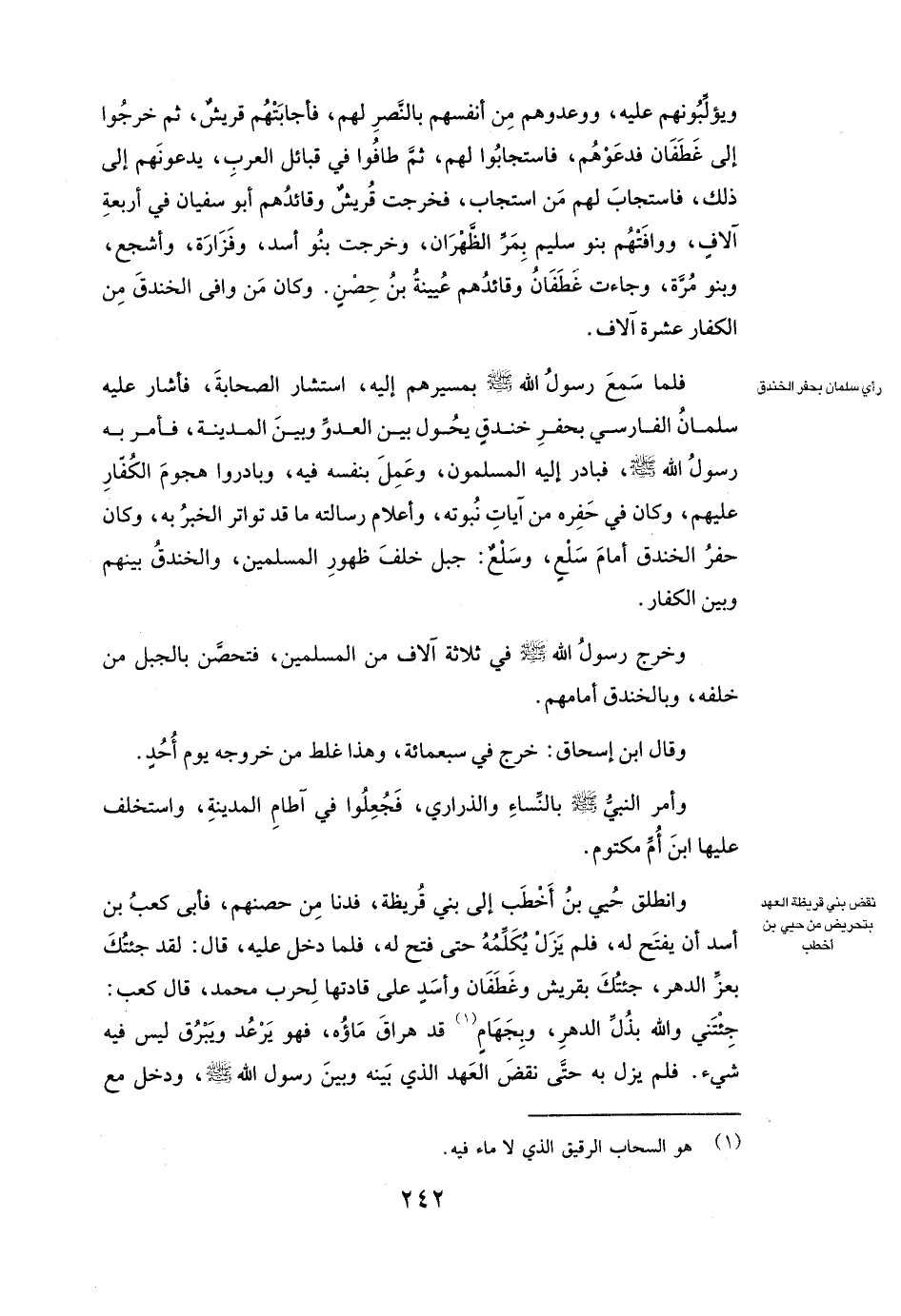 وَيُؤَلِّبُونَهُمْ عَلَيْهِ، وَوَعَدُوهُمْ مِنْ أَنْفُسِهِمْ بِالنَّصْرِ لَهُمْ، فَأَجَابَتْهُمْ قُرَيْشٌ، ثُمَّ خَرَجُوا إِلَى غَطَفَانَ، فَدَعَوْهُمْ، فَاسْتَجَابُوا لَهُمْ، ثُمَّ طَافُوا فِي قَبَائِلِ الْعَرَبِ يَدْعُونَهُمْ إلَى ذَلِكَ، فَاسْتَجَابَ لَهُمْ مَنِ اسْتَجَابَ، فَخَرَجَتْ قُرَيْشٌ وَقَائِدُهُمْ أبو سفيان فِي أَرْبَعَةِ آلَافٍ، وَوَافَتْهُمْ بَنُو سُلَيْمٍ بِمَرِّ الظَّهْرَانِ، وَخَرَجَتْ بَنُو أَسَدٍ وَفَزَارَةُ وَأَشْجَعُ وَبَنُو مُرَّةَ، وَجَاءَتْ غَطَفَانُ وَقَائِدُهُمْ عيينة بن حصن. وَكَانَ مَنْ وَافَى الْخَنْدَقَ مِنَ الْكُفَّارِ عَشَرَةَ آلَافٍ.