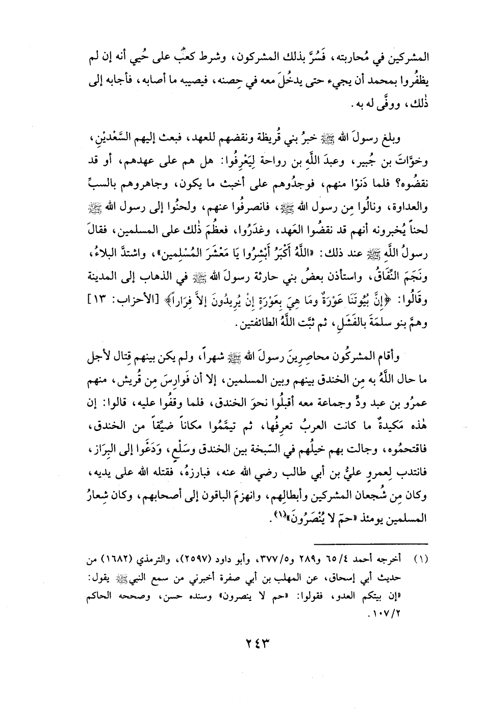 وَأَقَامَ الْمُشْرِكُونَ مُحَاصِرِينَ رَسُولَ اللَّهِ صَلَّى اللَّهُ عَلَيْهِ وَسَلَّمَ شَهْرًا، وَلَمْ يَكُنْ بَيْنَهُمْ قِتَالٌ لِأَجْلِ مَا حَالَ اللَّهُ بِهِ مِنَ الْخَنْدَقِ بَيْنَهُمْ وَبَيْنَ الْمُسْلِمِينَ، إلَّا أَنَّ فَوَارِسَ مِنْ قُرَيْشٍ مِنْهُمْ عمرو بن عبد ود، وَجَمَاعَةٌ مَعَهُ أَقْبَلُوا نَحْوَ الْخَنْدَقِ، فَلَمَّا وَقَفُوا عَلَيْهِ قَالُوا: إنَّ هَذِهِ مَكِيدَةٌ مَا كَانَتِ الْعَرَبُ تَعْرِفُهَا، ثُمَّ تَيَمَّمُوا مَكَانًا ضَيِّقًا مِنَ الْخَنْدَقِ، فَاقْتَحَمُوهُ، وَجَالَتْ بِهِمْ خَيْلُهُمْ فِي السَّبْخَةِ بَيْنَ الْخَنْدَقِ وَسَلْعٍ، وَدَعَوْا إِلَى الْبِرَازِ، فَانْتُدِبَ لعمرو عَلِيٌّ بْنُ أَبِي طَالِبٍ رَضِيَ اللَّهُ عَنْهُ، فَبَارَزَهُ، فَقَتَلَهُ اللَّهُ عَلَى يَدَيْهِ، وَكَانَ مِنْ شُجْعَانِ الْمُشْرِكِينَ وَأَبْطَالِهِمْ، وَانْهَزَمَ الْبَاقُونَ إلَى أَصْحَابِهِمْ (وَكَانَ شِعَارُ الْمُسْلِمِينَ يَوْمَئِذٍ " حم لَا يُنْصَرُونَ) .