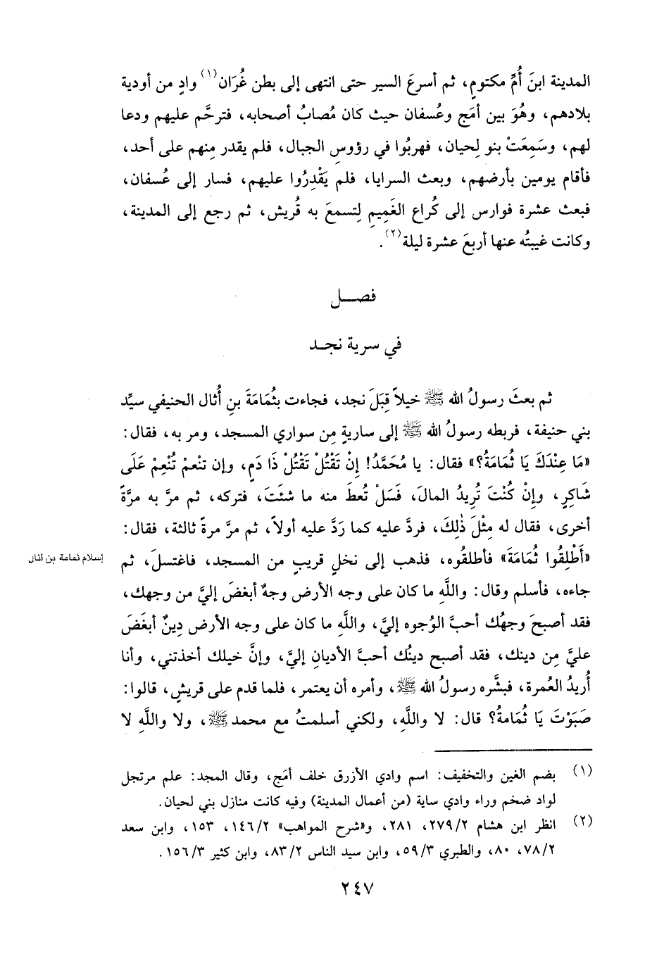 ثُمَّ بَعَثَ رَسُولُ اللَّهِ صَلَّى اللَّهُ عَلَيْهِ وَسَلَّمَ خَيْلًا قِبَلَ نَجْدٍ، فَجَاءَتْ بثمامة بن أثال الحنيفي سَيِّدِ بَنِي حَنِيفَةَ، فَرَبَطَهُ رَسُولُ اللَّهِ صَلَّى اللَّهُ عَلَيْهِ وَسَلَّمَ إِلَى سَارِيَةٍ مِنْ سَوَارِي الْمَسْجِدِ، وَمَرَّ بِهِ فَقَالَ: مَا عِنْدَكَ يَا ثمامة؟ فَقَالَ: يَا مُحَمَّدُ إنْ تَقْتُلْ تَقْتُلْ ذَا دَمٍ، وَإِنْ تُنْعِمْ تُنْعِمْ عَلَى شَاكِرٍ، وَإِنْ كُنْتَ تُرِيدُ الْمَالَ، فَسَلْ تُعْطَ مِنْهُ مَا شِئْتَ، فَتَرَكَهُ، ثُمَّ مَرَّ بِهِ مَرَّةً أُخْرَى، فَقَالَ لَهُ مِثْلَ ذَلِكَ، فَرَدَّ عَلَيْهِ كَمَا رَدَّ عَلَيْهِ أَوَّلًا، ثُمَّ مَرَّ مَرَّةً ثَالِثَةً، فَقَالَ: أَطْلِقُوا ثمامة، فَأَطْلَقُوهُ، فَذَهَبَ إِلَى نَخْلٍ قَرِيبٍ مِنَ الْمَسْجِدِ، فَاغْتَسَلَ، ثُمَّ جَاءَهُ، فَأَسْلَمَ، وَقَالَ: وَاللَّهِ مَا كَانَ عَلَى وَجْهِ الْأَرْضِ وَجْهٌ أَبْغَضَ إلَيَّ مِنْ وَجْهِكَ، فَقَدْ أَصْبَحَ وَجْهُكَ أَحَبَّ الْوُجُوهِ إلَيَّ، وَاللَّهِ مَا كَانَ عَلَى وَجْهِ الْأَرْضِ دِينٌ أَبْغَضَ عَلَيَّ مِنْ دِينِكَ، فَقَدْ أَصْبَحَ دِينُكَ أَحَبَّ الْأَدْيَانِ إلَيَّ، وَإِنَّ خَيْلَكَ أَخَذَتْنِي وَأَنَا أُرِيدُ الْعُمْرَةَ، فَبَشَّرَهُ رَسُولُ اللَّهِ صَلَّى اللَّهُ عَلَيْهِ وَسَلَّمَ، وَأَمَرَهُ أَنْ يَعْتَمِرَ، فَلَمَّا قَدِمَ عَلَى قُرَيْشٍ قَالُوا: صَبَوْتَ يَا ثمامة؟ قَالَ: لَا وَاللَّهِ، وَلَكِنِّي أَسْلَمْتُ مَعَ مُحَمَّدٍ صَلَّى اللَّهُ عَلَيْهِ وَسَلَّمَ، وَلَا وَاللَّهِ لَا