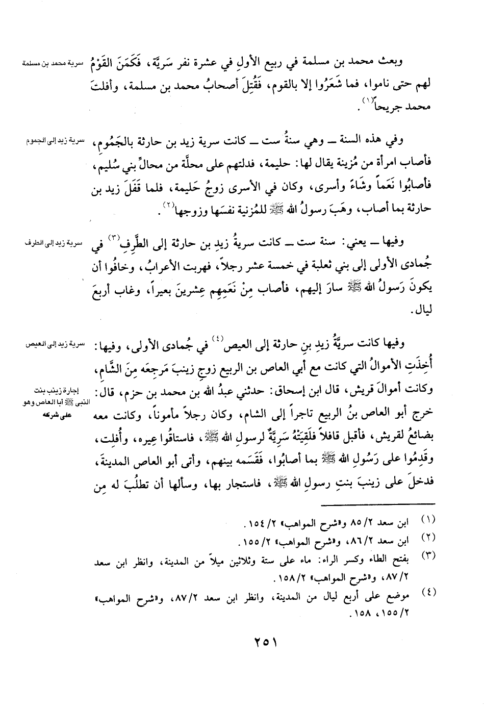 وَفِيهَا كَانَتْ سَرِيَّةُ زَيْدِ بْنِ حَارِثَةَ إِلَى الْعِيصِ فِي جُمَادَى الْأُولَى، وَفِيهَا: أُخِذَتِ الْأَمْوَالُ الَّتِي كَانَتْ مَعَ أَبِي الْعَاصِ بْنِ الرَّبِيعِ زَوْجِ زَيْنَبَ مَرْجِعَهُ مِنَ الشَّامِ، وَكَانَتْ أَمْوَالُ قُرَيْشٍ، قَالَ ابْنُ إسْحَاقَ: حَدَّثَنِي عبد الله بن محمد بن حزم قَالَ: خَرَجَ أَبُو الْعَاصِ بْنُ الرَّبِيعِ تَاجِرًا إلَى الشَّامِ وَكَانَ رَجُلًا مَأْمُونًا، وَكَانَتْ مَعَهُ بَضَائِعُ لِقُرَيْشٍ، فَأَقْبَلَ قَافِلًا، فَلَقِيَتْهُ سَرِيَّةٌ لِرَسُولِ اللَّهِ صَلَّى اللَّهُ عَلَيْهِ وَسَلَّمَ، فَاسْتَاقُوا عِيرَهُ وَأَفْلَتَ، وَقَدِمُوا عَلَى رَسُولِ اللَّهِ صَلَّى اللَّهُ عَلَيْهِ وَسَلَّمَ بِمَا أَصَابُوا، فَقَسَّمَهُ بَيْنَهُمْ، وَأَتَى أبو العاص الْمَدِينَةَ، فَدَخَلَ عَلَى زينب بِنْتِ رَسُولِ اللَّهِ صَلَّى اللَّهُ عَلَيْهِ وَسَلَّمَ، فَاسْتَجَارَ بِهَا، وَسَأَلَهَا أَنْ تَطْلُبَ لَهُ مِنْ