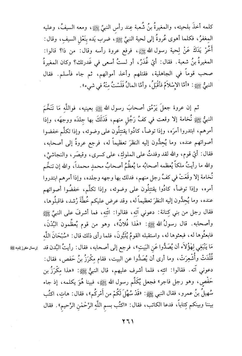 كَلَّمَهُ أَخَذَ بِلِحْيَتِهِ، وَالْمُغِيرَةُ بْنُ شُعْبَةَ عِنْدَ رَأْسِ النَّبِيِّ صَلَّى اللَّهُ عَلَيْهِ وَسَلَّمَ وَمَعَهُ السَّيْفُ وَعَلَيْهِ الْمِغْفَرُ، فَكُلَّمَا أَهْوَى عروة إِلَى لِحْيَةِ النَّبِيِّ صَلَّى اللَّهُ عَلَيْهِ وَسَلَّمَ ضَرَبَ يَدَهُ بِنَعْلِ السَّيْفِ وَقَالَ: أَخِّرْ يَدَكَ عَنْ لِحْيَةِ رَسُولِ اللَّهِ صَلَّى اللَّهُ عَلَيْهِ وَسَلَّمَ. فَرَفَعَ عروة رَأْسَهُ وَقَالَ: مَنْ ذَا؟ قَالُوا: الْمُغِيرَةُ بْنُ شُعْبَةَ. فَقَالَ: أَيْ غُدَرُ، أَوَلَسْتُ أَسْعَى فِي غَدْرَتِكَ؟ وَكَانَ المغيرة صَحِبَ قَوْمًا فِي الْجَاهِلِيَّةِ فَقَتَلَهُمْ وَأَخَذَ أَمْوَالَهُمْ ثُمَّ جَاءَ فَأَسْلَمَ، فَقَالَ النَّبِيُّ صَلَّى اللَّهُ عَلَيْهِ وَسَلَّمَ: (أَمَّا الْإِسْلَامُ فَأَقْبَلُ، وَأَمَّا الْمَالُ فَلَسْتُ مِنْهُ فِي شَيْء)