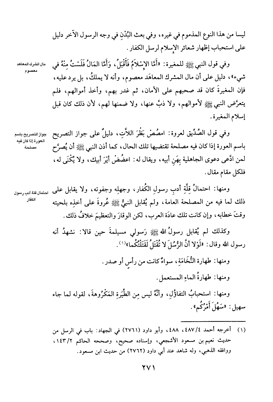 وَفِي قَوْلِ النَّبِيِّ صَلَّى اللَّهُ عَلَيْهِ وَسَلَّمَ للمغيرة: ( «أَمَّا الْإِسْلَامُ فَأَقْبَلُ، وَأَمَّا الْمَالُ فَلَسْتُ مِنْهُ فِي شَيْءٍ» ) دَلِيلٌ عَلَى أَنَّ مَالَ الْمُشْرِكِ الْمُعَاهَدِ مَعْصُومٌ، وَأَنَّهُ لَا يُمْلَكُ بَلْ يُرَدُّ عَلَيْهِ؛ فَإِنَّ المغيرة كَانَ قَدْ صَحِبَهُمْ عَلَى الْأَمَانِ ثُمَّ غَدَرَ بِهِمْ وَأَخَذَ أَمْوَالَهُمْ، فَلَمْ يَتَعَرَّضِ النَّبِيُّ صَلَّى اللَّهُ عَلَيْهِ وَسَلَّمَ لِأَمْوَالِهِمْ وَلَا ذَبَّ عَنْهَا، وَلَا ضَمِنَهَا لَهُمْ؛ لِأَنَّ ذَلِكَ كَانَ قَبْلَ إِسْلَامِ المغيرة.