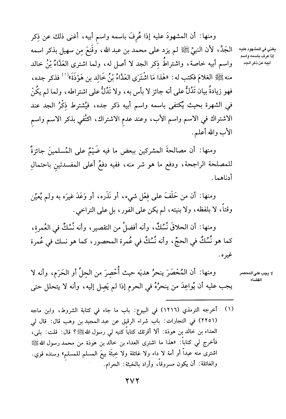 وَمِنْهَا: أَنَّ الْمَشْهُودَ عَلَيْهِ إِذَا عُرِفَ بِاسْمِهِ وَاسْمِ أَبِيهِ أَغْنَى ذَلِكَ عَنْ ذِكْرِ الْجَدِّ؛ لِأَنَّ النَّبِيَّ صَلَّى اللَّهُ عَلَيْهِ وَسَلَّمَ لَمْ يَزِدْ عَلَى مُحَمَّدِ بْنِ عَبْدِ اللَّهِ، وَقَنِعَ مِنْ سهيل بِذِكْرِ اسْمِهِ وَاسْمِ أَبِيهِ خَاصَّةً، وَاشْتِرَاطُ ذِكْرِ الْجَدِّ لَا أَصْلَ لَهُ، وَلَمَّا اشْتَرَى العداء بن خالد مِنْهُ صَلَّى اللَّهُ عَلَيْهِ وَسَلَّمَ الْغُلَامَ، فَكَتَبَ لَهُ: ( «هَذَا مَا اشْتَرَى العداء بن خالد بن هوذة» ) ، فَذَكَرَ جَدَّهُ، فَهُوَ زِيَادَةُ بَيَانٍ تَدُلُّ عَلَى أَنَّهُ جَائِزٌ لَا بَأْسَ بِهِ، وَلَا تَدُلُّ عَلَى اشْتِرَاطِهِ، وَلَمَّا لَمْ يَكُنْ فِي الشُّهْرَةِ بِحَيْثُ يُكْتَفَى بِاسْمِهِ وَاسْمِ أَبِيهِ ذَكَرَ جَدَّهُ، فَيُشْتَرَطُ ذِكْرُ الْجَدِّ عِنْدَ الِاشْتِرَاكِ فِي الِاسْمِ وَاسْمِ الْأَبِ، وَعِنْدَ عَدَمِ الِاشْتِرَاكِ اكْتُفِيَ بِذِكْرِ الِاسْمِ وَاسْمِ الْأَبِ. وَاللَّهُ أَعْلَمُ.