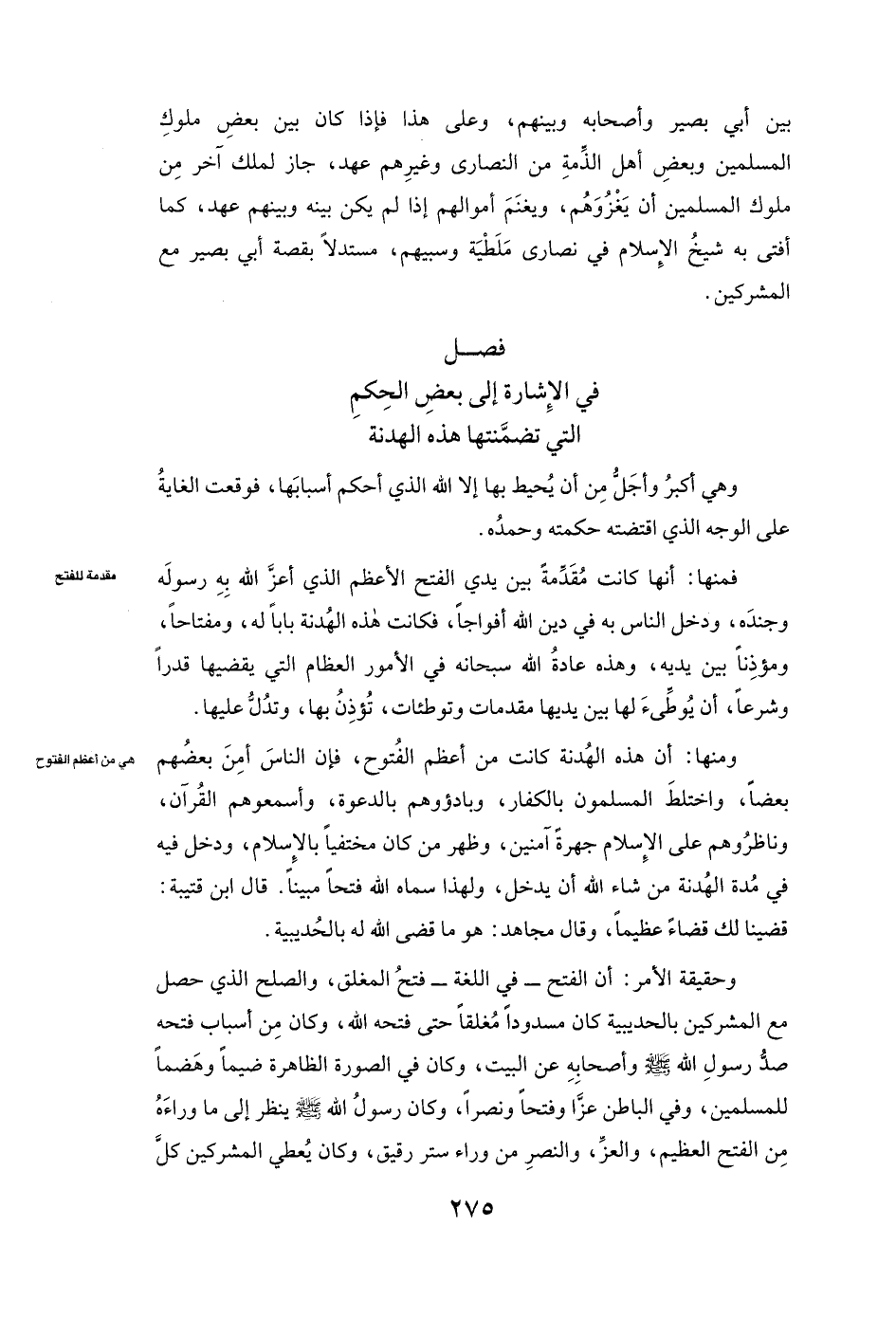 بَيْنَ أبي بصير وَأَصْحَابِهِ وَبَيْنَهُمْ، وَعَلَى هَذَا فَإِذَا كَانَ بَيْنَ بَعْضِ مُلُوكِ الْمُسْلِمِينَ وَبَعْضِ أَهْلِ الذِّمَّةِ مِنَ النَّصَارَى وَغَيْرِهِمْ عَهْدٌ جَازَ لِمَلِكٍ آخَرَ مِنْ مُلُوكِ الْمُسْلِمِينَ أَنْ يَغْزُوَهُمْ وَيَغْنَمَ أَمْوَالَهُمْ إِذَا لَمْ يَكُنْ بَيْنَهُ وَبَيْنَهُمْ عَهْدٌ، كَمَا أَفْتَى بِهِ شَيْخُ الْإِسْلَامِ فِي نَصَارَى مَلَطْيَةَ وَسَبْيِهِمْ، مُسْتَدِلًّا بِقِصَّةِ أبي بصير مَعَ الْمُشْرِكِينَ.