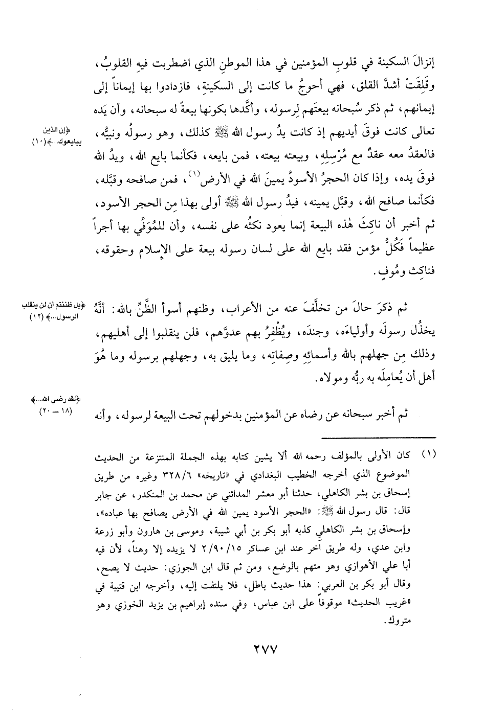 إِنْزَالَ السَّكِينَةِ فِي قُلُوبِ الْمُؤْمِنِينَ فِي هَذَا الْمَوْطِنِ الَّذِي اضْطَرَبَتْ فِيهِ الْقُلُوبُ وَقَلِقَتْ أَشَدَّ الْقَلَقِ، فَهِيَ أَحْوَجُ مَا كَانَتْ إِلَى السَّكِينَةِ، فَازْدَادُوا بِهَا إِيمَانًا إِلَى إِيمَانِهِمْ، ثُمَّ ذَكَرَ سُبْحَانَهُ بَيْعَتَهُمْ لِرَسُولِهِ وَأَكَّدَهَا بِكَوْنِهَا بَيْعَةً لَهُ سُبْحَانَهُ، وَأَنَّ يَدَهُ تَعَالَى كَانَتْ فَوْقَ أَيْدِيهِمْ إِذْ كَانَتْ يَدُ رَسُولِ اللَّهِ صَلَّى اللَّهُ عَلَيْهِ وَسَلَّمَ كَذَلِكَ، وَهُوَ رَسُولُهُ وَنَبِيُّهُ، فَالْعَقْدُ مَعَهُ عَقْدٌ مَعَ مُرْسِلِهِ، وَبَيْعَتُهُ بَيْعَتُهُ، فَمَنْ بَايَعَهُ فَكَأَنَّمَا بَايَعَ اللَّهَ، وَيَدُ اللَّهِ فَوْقَ يَدِهِ، وَإِذَا كَانَ ( «الْحَجَرُ الْأَسْوَدُ يَمِينَ اللَّهِ فِي الْأَرْضِ، فَمَنْ صَافَحَهُ وَقَبَّلَهُ فَكَأَنَّمَا صَافَحَ اللَّهَ وَقَبَّلَ يَمِينَهُ» ) فَيَدُ رَسُولِ اللَّهِ صَلَّى اللَّهُ عَلَيْهِ وَسَلَّمَ أَوْلَى بِهَذَا مِنَ الْحَجَرِ الْأَسْوَدِ. ثُمَّ أَخْبَرَ أَنَّ نَاكِثَ هَذِهِ الْبَيْعَةِ إِنَّمَا يَعُودُ نَكْثُهُ عَلَى نَفْسِهِ، وَأَنَّ لِلْمُوَفِّي بِهَا أَجْرًا عَظِيمًا، فَكُلُّ مُؤْمِنٍ قَدْ بَايَعَ اللَّهَ عَلَى لِسَانِ رَسُولِهِ بَيْعَةً عَلَى الْإِسْلَامِ وَحُقُوقِهِ، فَنَاكِثٌ وَمُوفٍ.