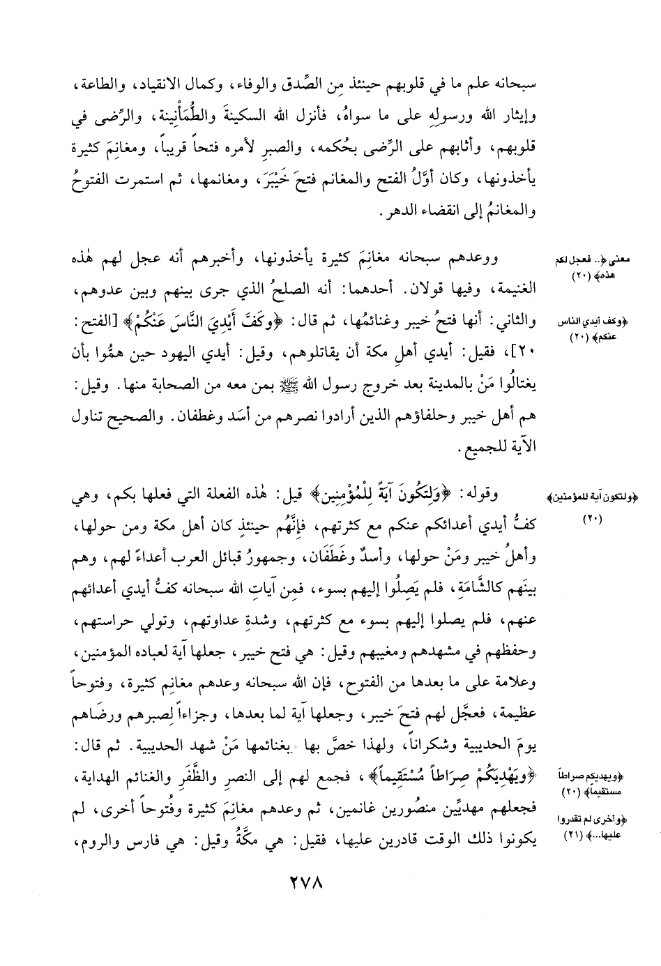 وَقَوْلُهُ: {وَلِتَكُونَ آيَةً لِلْمُؤْمِنِينَ} [الفتح: 20] قِيلَ: هَذِهِ الْفِعْلَةُ الَّتِي فَعَلَهَا بِكُمْ وَهِيَ كَفُّ أَيْدِي أَعْدَائِكُمْ عَنْكُمْ مَعَ كَثْرَتِهِمْ، فَإِنَّهُمْ حِينَئِذٍ كَانَ أَهْلُ مَكَّةَ وَمَنْ حَوْلَهَا وَأَهْلُ خَيْبَرَ وَمَنْ حَوْلَهَا وَأَسَدٌ وَغَطَفَانُ، وَجُمْهُورُ قَبَائِلِ الْعَرَبِ أَعْدَاءً لَهُمْ، وَهُمْ بَيْنَهُمْ كَالشَّامَةِ، فَلَمْ يَصِلُوا إِلَيْهِمْ بِسُوءٍ، فَمِنْ آيَاتِ اللَّهِ سُبْحَانَهُ كَفُّ أَيْدِي أَعْدَائِهِمْ عَنْهُمْ، فَلَمْ يَصِلُوا إِلَيْهِمْ بِسُوءٍ مَعَ كَثْرَتِهِمْ وَشِدَّةِ عَدَاوَتِهِمْ، وَتَوَلِّي حِرَاسَتِهِمْ وَحِفْظِهِمْ فِي مَشْهَدِهِمْ وَمَغِيبِهِمْ، وَقِيلَ: هِيَ فَتْحُ خَيْبَرَ، جَعَلَهَا آيَةً لِعِبَادِهِ الْمُؤْمِنِينَ وَعَلَامَةً عَلَى مَا بَعْدَهَا مِنَ الْفُتُوحِ، فَإِنَّ اللَّهَ سُبْحَانَهُ وَعَدَهُمْ مَغَانِمَ كَثِيرَةً وَفُتُوحًا عَظِيمَةً، فَعَجَّلَ لَهُمْ فَتْحَ خَيْبَرَ وَجَعَلَهَا آيَةً لِمَا بَعْدَهَا وَجَزَاءً لِصَبْرِهِمْ وَرِضَاهُمْ يَوْمَ الْحُدَيْبِيَةِ وَشُكْرَانًا، وَلِهَذَا خَصَّ بِهَا وَبِغَنَائِمِهَا مَنْ شَهِدَ الْحُدَيْبِيَةَ. ثُمَّ قَالَ: {وَيَهْدِيَكُمْ صِرَاطًا مُسْتَقِيمًا} [الفتح: 20] ، فَجَمَعَ لَهُمْ إِلَى النَّصْرِ وَالظَّفَرِ وَالْغَنَائِمِ الْهِدَايَةَ، فَجَعَلَهُمْ مَهْدِيِّينَ مَنْصُورِينَ غَانِمِينَ، ثُمَّ وَعَدَهُمْ مَغَانِمَ كَثِيرَةً وَفُتُوحًا أُخْرَى لَمْ يَكُونُوا ذَلِكَ الْوَقْتَ قَادِرِينَ عَلَيْهَا، فَقِيلَ: هِيَ مَكَّةُ، وَقِيلَ: هِيَ فَارِسُ وَالرُّومُ،