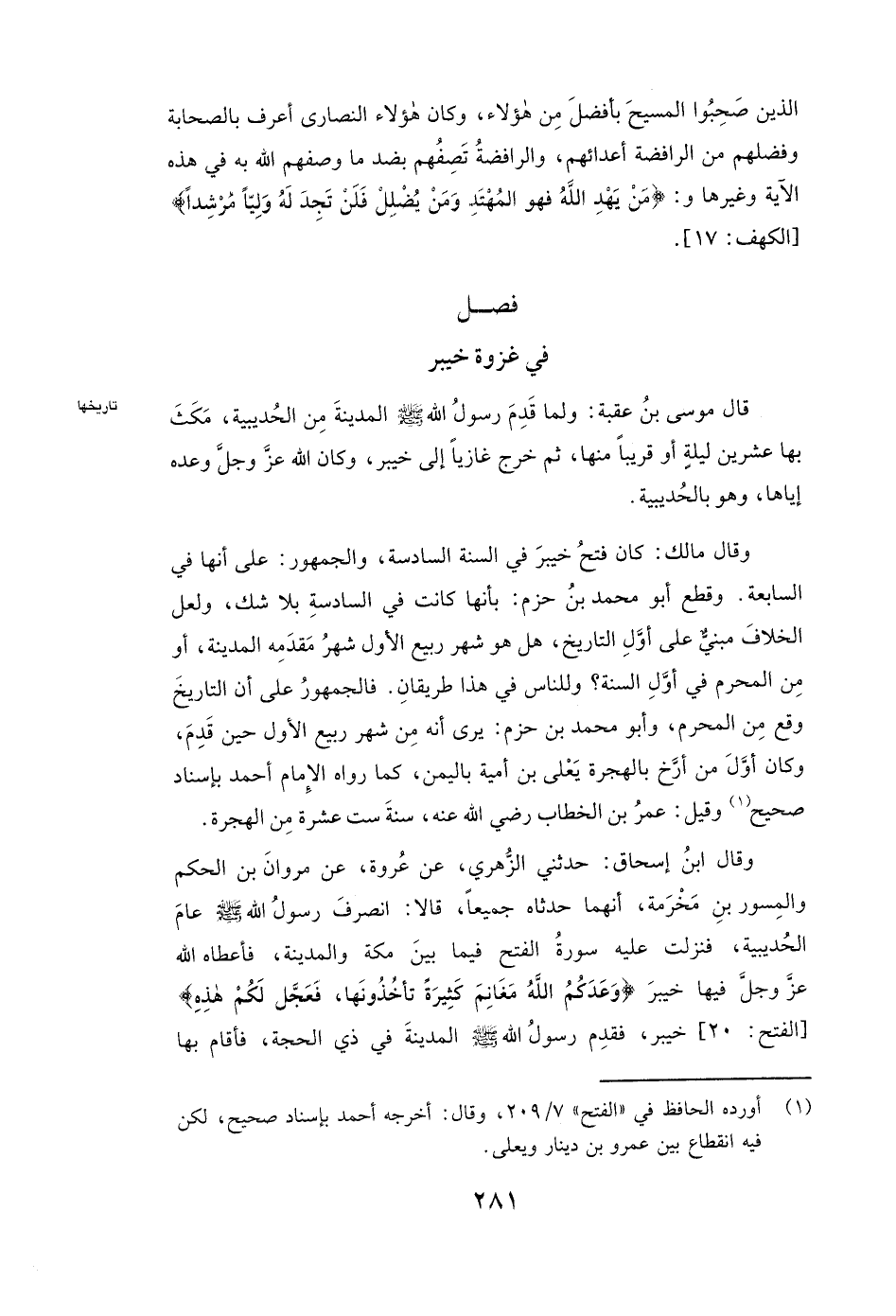 وَقَالَ مالك: كَانَ فَتْحُ خَيْبَرَ فِي السَّنَةِ السَّادِسَةِ، وَالْجُمْهُورُ عَلَى أَنَّهَا فِي السَّابِعَةِ. وَقَطَعَ أَبُو مُحَمَّدِ بْنُ حَزْمٍ بِأَنَّهَا كَانَتْ فِي السَّادِسَةِ بِلَا شَكٍّ، وَلَعَلَّ الْخِلَافَ مَبْنِيٌّ عَلَى أَوَّلِ التَّارِيخِ، هَلْ هُوَ شَهْرُ رَبِيعٍ الْأَوَّلِ شَهْرُ مَقْدَمِهِ الْمَدِينَةَ أَوْ مِنَ الْمُحَرَّمِ فِي أَوَّلِ السَّنَةِ؟ وَلِلنَّاسِ فِي هَذَا طَرِيقَانِ: فَالْجُمْهُورُ عَلَى أَنَّ التَّارِيخَ وَقَعَ مِنَ الْمُحَرَّمِ، وَأَبُو مُحَمَّدِ بْنُ حَزْمٍ يَرَى أَنَّهُ مِنْ شَهْرِ رَبِيعٍ الْأَوَّلِ حِينَ قَدِمَ، (وَكَانَ أَوَّلُ مَنْ أَرَّخَ بِالْهِجْرَةِ يَعْلَى بْنُ أُمَيَّةَ بِالْيَمَنِ) كَمَا رَوَاهُ الْإِمَامُ أَحْمَدُ بِإِسْنَادٍ صَحِيحٍ، وَقِيلَ: عُمَرُ بْنُ الْخَطَّابِ رَضِيَ اللَّهُ عَنْهُ سَنَةَ سِتَّ عَشْرَةٍ مِنَ الْهِجْرَةِ.