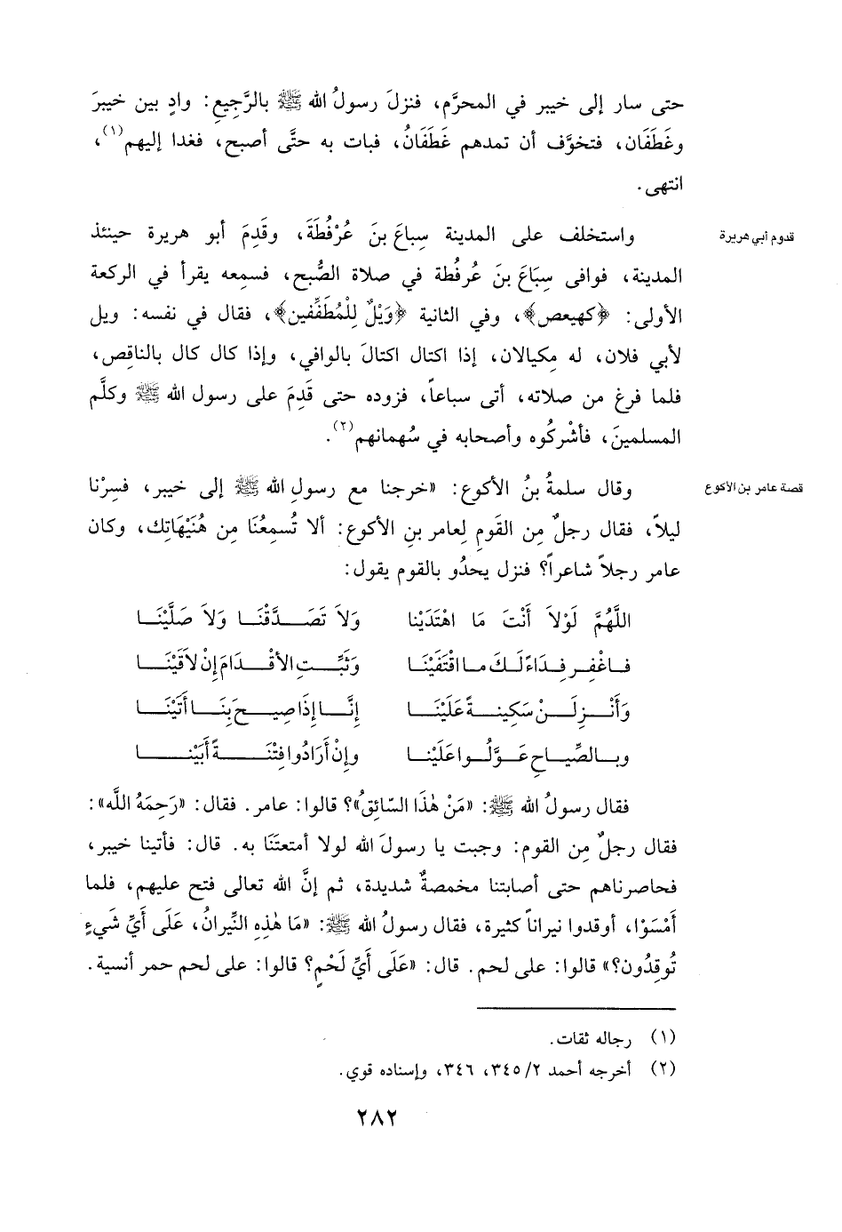 وَقَالَ سَلَمَةُ بْنُ الْأَكْوَعِ: " خَرَجْنَا مَعَ رَسُولِ اللَّهِ صَلَّى اللَّهُ عَلَيْهِ وَسَلَّمَ إِلَى خَيْبَرَ، فَسِرْنَا لَيْلًا، فَقَالَ رَجُلٌ مِنَ الْقَوْمِ لعامر بن الأكوع: أَلَا تُسْمِعُنَا مِنْ هُنَيْهَاتِكَ؟ وَكَانَ عامر رَجُلًا شَاعِرًا، فَنَزَلَ يَحْدُو بِالْقَوْمِ يَقُولُ: