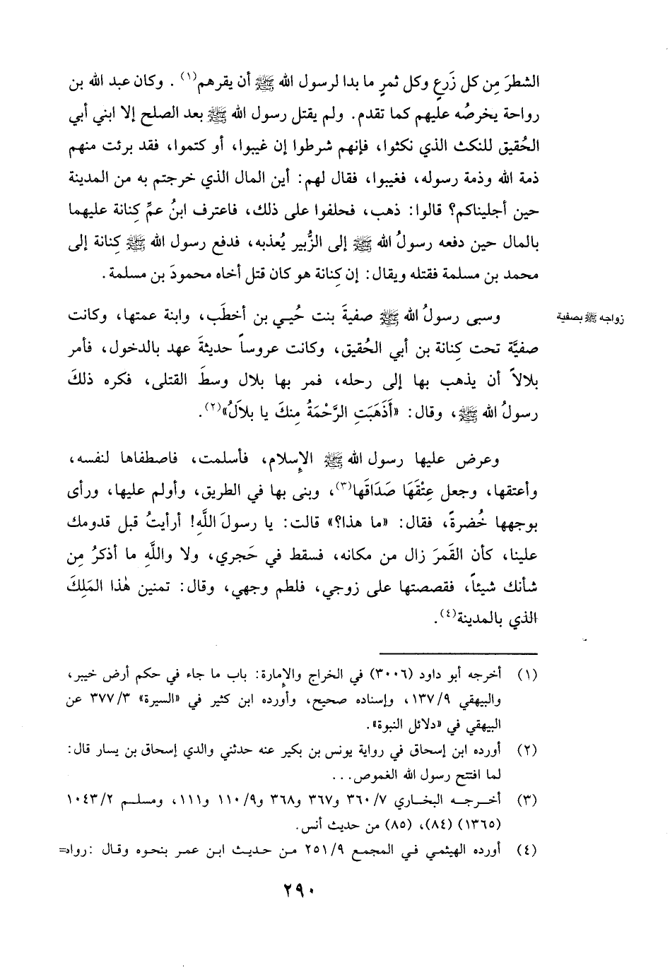 ( «وَسَبَى رَسُولُ اللَّهِ صَلَّى اللَّهُ عَلَيْهِ وَسَلَّمَ صفية بنت حيي بن أخطب وَابْنَةَ عَمَّتِهَا، وَكَانَتْ صفية تَحْتَ كنانة بن أبي الحقيق، وَكَانَتْ عَرُوسًا حَدِيثَةَ عَهْدٍ بِالدُّخُولِ، فَأَمَرَ بلالا أَنْ يَذْهَبَ بِهَا إِلَى رَحْلِهِ، فَمَرَّ بِهَا بلال وَسْطَ الْقَتْلَى، فَكَرِهَ ذَلِكَ رَسُولُ اللَّهِ صَلَّى اللَّهُ عَلَيْهِ وَسَلَّمَ وَقَالَ: أَذَهَبَتِ الرَّحْمَةُ مِنْكَ يَا بلال؟!)