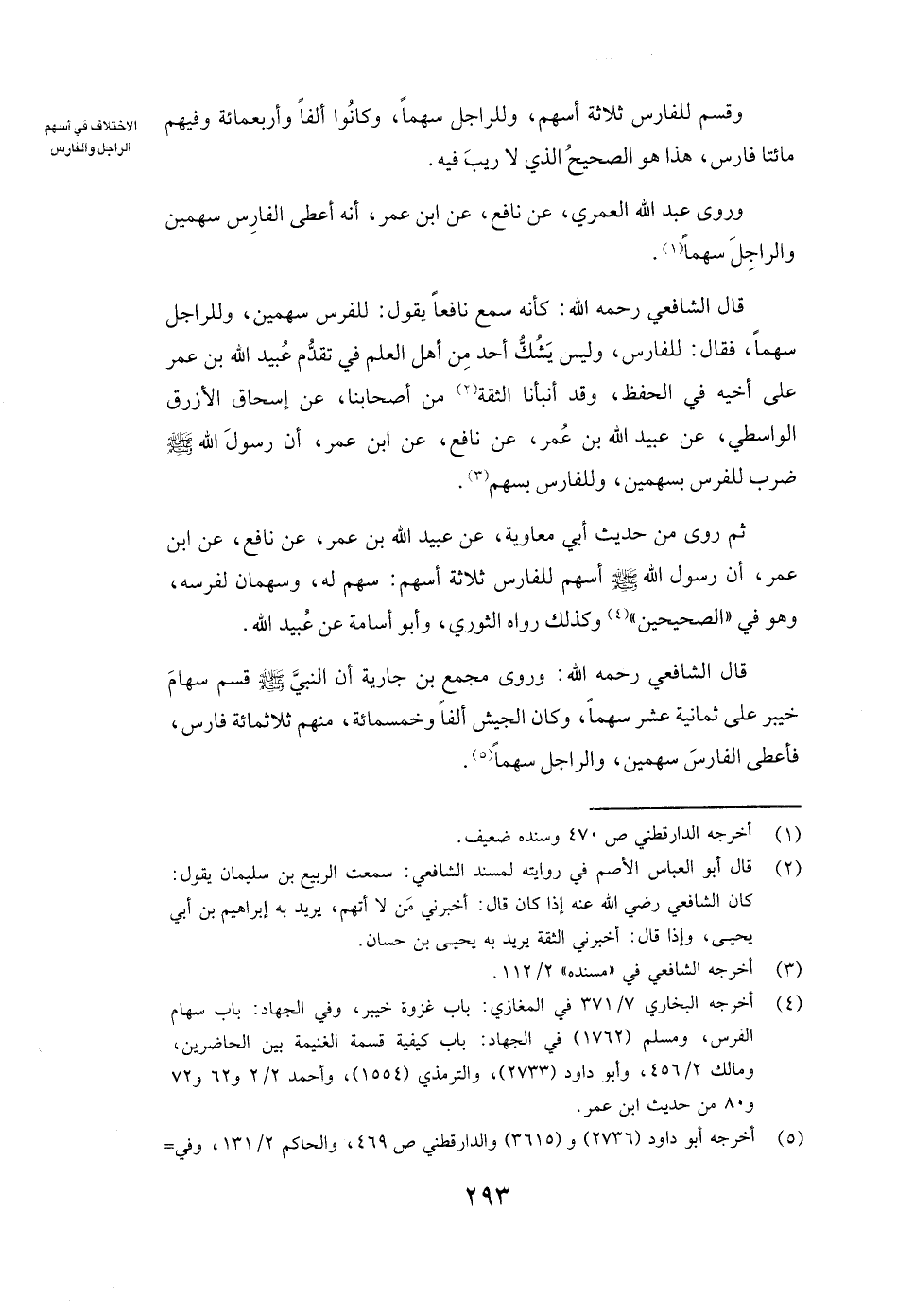 قَالَ الشَّافِعِيُّ رَحِمَهُ اللَّهُ: كَأَنَّهُ سَمِعَ نافعا يَقُولُ: لِلْفَرَسِ سَهْمَيْنِ، وَلِلرَّاجِلِ سَهْمًا، فَقَالَ: لِلْفَارِسِ، وَلَيْسَ يَشُكُّ أَحَدٌ مِنْ أَهْلِ الْعِلْمِ فِي تَقَدُّمِ عُبَيْدِ اللَّهِ بْنِ عُمَرَ عَلَى أَخِيهِ فِي الْحِفْظِ، وَقَدْ أَنْبَأَنَا الثِّقَةُ مِنْ أَصْحَابِنَا عَنْ إسحاق الأزرق الواسطي، عَنْ عُبَيْدِ اللَّهِ بْنِ عُمَرَ، عَنْ نافع، عَنِ ابْنِ عُمَرَ، أَنَّ رَسُولَ اللَّهِ صَلَّى اللَّهُ عَلَيْهِ وَسَلَّمَ ( «ضَرَبَ لِلْفَرَسِ بِسَهْمَيْنِ وَلِلْفَارِسِ بِسَهْمٍ» ) .
