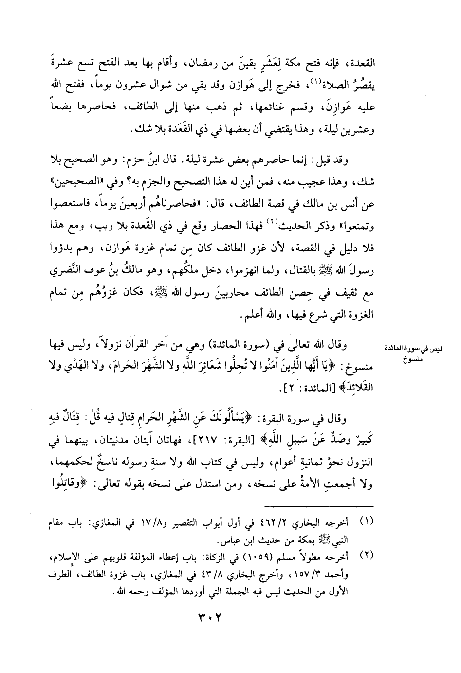 وَقَالَ اللَّهُ تَعَالَى فِي سُورَةِ الْمَائِدَةِ، وَهِيَ مِنْ آخِرِ الْقُرْآنِ نُزُولًا، وَلَيْسَ فِيهَا مَنْسُوخٌ: {يَاأَيُّهَا الَّذِينَ آمَنُوا لَا تُحِلُّوا شَعَائِرَ اللَّهِ وَلَا الشَّهْرَ الْحَرَامَ وَلَا الْهَدْيَ وَلَا الْقَلَائِدَ} [المائدة: 2] [الْمَائِدَةِ: 2] .