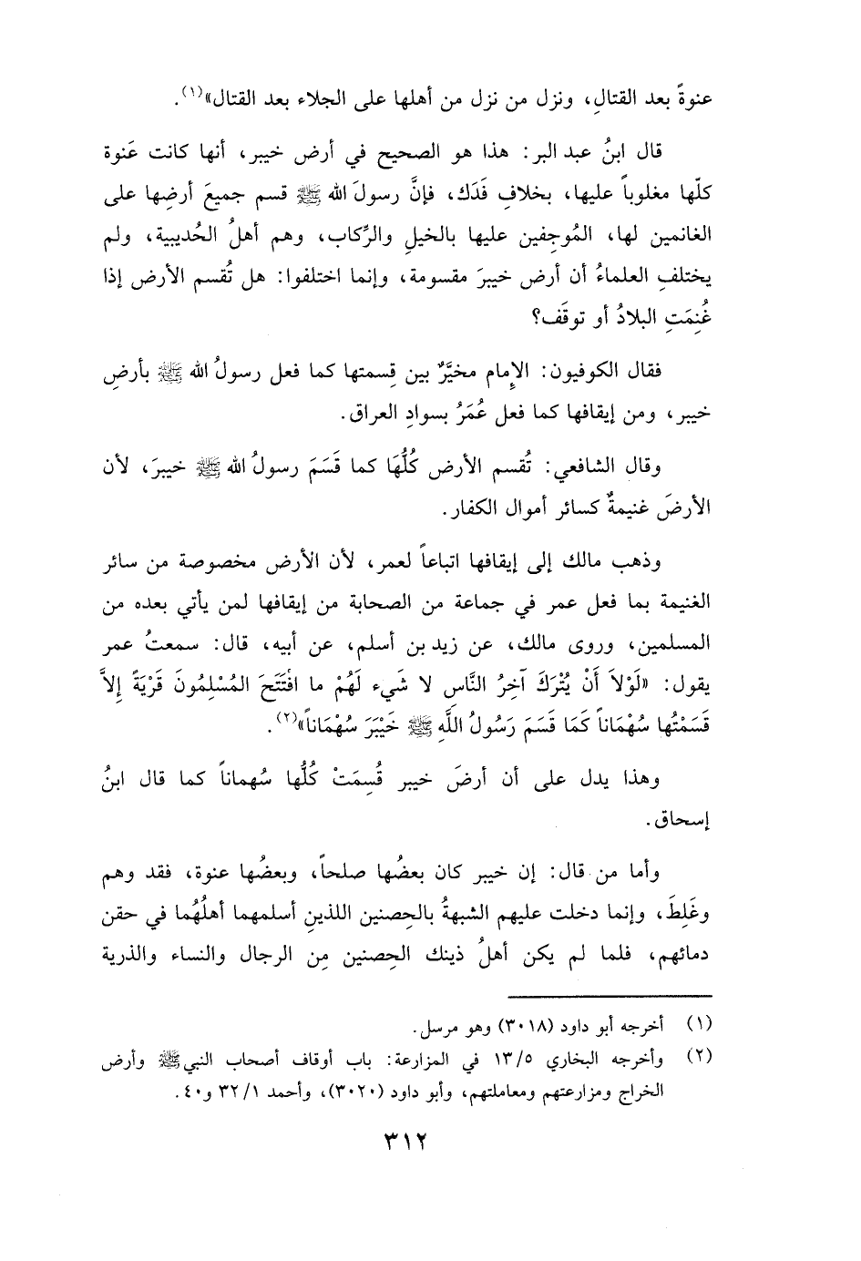 قَالَ ابْنُ عَبْدِ الْبَرِّ: هَذَا هُوَ الصَّحِيحُ فِي أَرْضِ خَيْبَرَ، أَنَّهَا كَانَتْ عَنْوَةً كُلُّهَا مَغْلُوبًا عَلَيْهَا، بِخِلَافِ فَدَكٍ؛ فَإِنَّ رَسُولَ اللَّهِ صَلَّى اللَّهُ عَلَيْهِ وَسَلَّمَ قَسَمَ جَمِيعَ أَرْضِهَا عَلَى الْغَانِمِينَ لَهَا الْمُوجِفِينَ عَلَيْهَا بِالْخَيْلِ وَالرِّكَابِ، وَهُمْ أَهْلُ الْحُدَيْبِيَةِ، وَلَمْ يَخْتَلِفِ الْعُلَمَاءُ أَنَّ أَرْضَ خَيْبَرَ مَقْسُومَةٌ، وَإِنَّمَا اخْتَلَفُوا: هَلْ تُقْسَمُ الْأَرْضُ إِذَا غُنِمَتِ الْبِلَادُ أَوْ تُوقَفُ؟