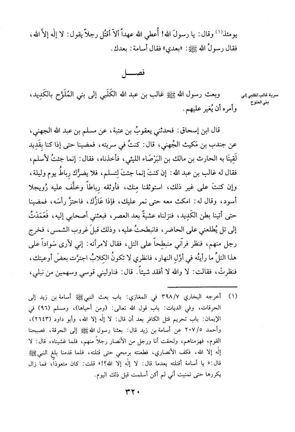 وَبَعَثَ رَسُولُ اللَّهِ - صَلَّى اللَّهُ عَلَيْهِ وَسَلَّمَ - غالب بن عبد الله الكلبي إِلَى بَنِي الْمُلَوَّحِ بِالْكَدِيدِ، وَأَمَرَهُ أَنْ يُغِيرَ عَلَيْهِمْ.