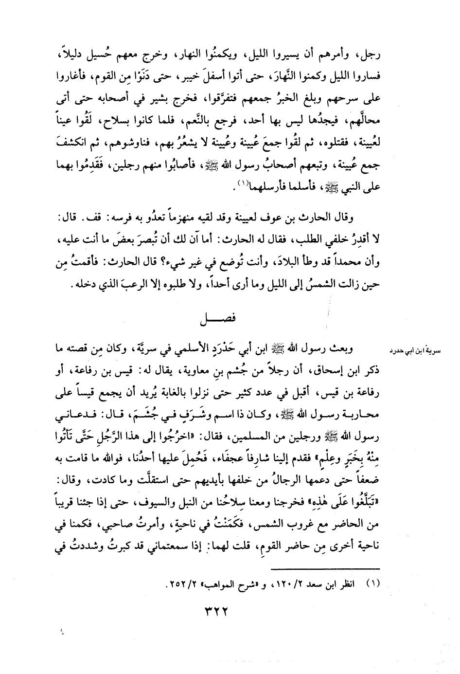 رَجُلٍ، وَأَمَرَهُمْ أَنْ يَسِيرُوا اللَّيْلَ، وَيَكْمُنُوا النَّهَارَ، وَخَرَجَ مَعَهُمْ حسيل دَلِيلًا، فَسَارُوا اللَّيْلَ وَكَمَنُوا النَّهَارَ، حَتَّى أَتَوْا أَسْفَلَ خَيْبَرَ، حَتَّى دَنَوْا مِنَ الْقَوْمِ فَأَغَارُوا عَلَى سَرْحِهِمْ، وَبَلَغَ الْخَبَرُ جَمْعَهُمْ، فَتَفَرَّقُوا، فَخَرَجَ بشير فِي أَصْحَابِهِ حَتَّى أَتَى مَحَالَّهُمْ، فَيَجِدُهَا لَيْسَ بِهَا أَحَدٌ، فَرَجَعَ بِالنَّعَمِ، فَلَمَّا كَانُوا بِسِلَاحٍ، لَقُوا عَيْنًا لعيينة، فَقَتَلُوهُ، ثُمَّ لَقُوا جَمْعَ عيينة وعيينة لَا يَشْعُرُ بِهِمْ، فَنَاوَشُوهُمْ، ثُمَّ انْكَشَفَ جَمْعُ عيينة، وَتَبِعَهُمْ أَصْحَابُ رَسُولِ اللَّهِ - صَلَّى اللَّهُ عَلَيْهِ وَسَلَّمَ - فَأَصَابُوا مِنْهُمْ رَجُلَيْنِ، فَقَدِمُوا بِهِمَا عَلَى النَّبِيِّ - صَلَّى اللَّهُ عَلَيْهِ وَسَلَّمَ - فَأَسْلَمَا فَأَرْسَلَهُمَا.