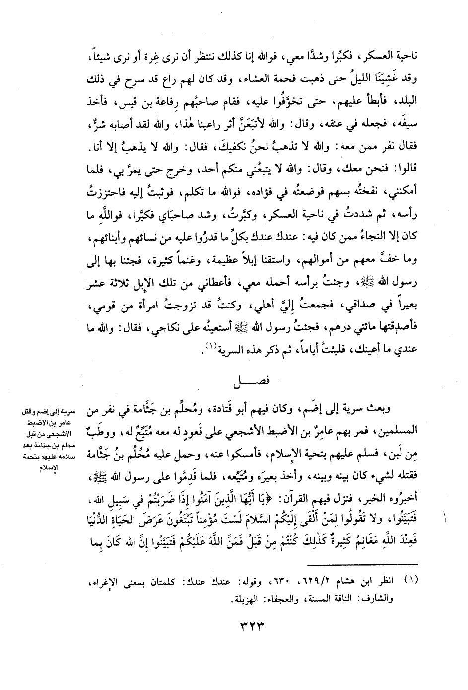 وَبَعَثَ سَرِيَّةً إِلَى إِضَمَ، وَكَانَ فِيهِمْ أَبُو قَتَادَةَ، ومحلم بن جثامة، فِي نَفَرٍ مِنَ الْمُسْلِمِينَ، فَمَرَّ بِهِمْ عامر بن الأضبط الأشجعي، عَلَى قَعُودٍ لَهُ مَعَهُ مُتَيِّعٌ لَهُ، وَوَطَبٌ مِنْ لَبَنٍ، فَسَلَّمَ عَلَيْهِمْ بِتَحِيَّةِ الْإِسْلَامِ، فَأَمْسَكُوا عَنْهُ وَحَمَلَ عَلَيْهِ محلم بن جثامة فَقَتَلَهُ؛ لِشَيْءٍ كَانَ بَيْنَهُ وَبَيْنَهُ، وَأَخَذَ بَعِيرَهُ وَمُتَيِّعَهُ، فَلَمَّا قَدِمُوا عَلَى رَسُولِ اللَّهِ - صَلَّى اللَّهُ عَلَيْهِ وَسَلَّمَ - أَخْبَرُوهُ الْخَبَرَ، فَنَزَلَ فِيهِمُ الْقُرْآنُ: {يَاأَيُّهَا الَّذِينَ آمَنُوا إِذَا ضَرَبْتُمْ فِي سَبِيلِ اللَّهِ فَتَبَيَّنُوا وَلَا تَقُولُوا لِمَنْ أَلْقَى إِلَيْكُمُ السَّلَامَ لَسْتَ مُؤْمِنًا تَبْتَغُونَ عَرَضَ الْحَيَاةِ الدُّنْيَا فَعِنْدَ اللَّهِ مَغَانِمُ كَثِيرَةٌ كَذَلِكَ كُنْتُمْ مِنْ قَبْلُ فَمَنَّ اللَّهُ عَلَيْكُمْ فَتَبَيَّنُوا إِنَّ اللَّهَ كَانَ بِمَا تَعْمَلُونَ خَبِيرًا} [النساء: 94]