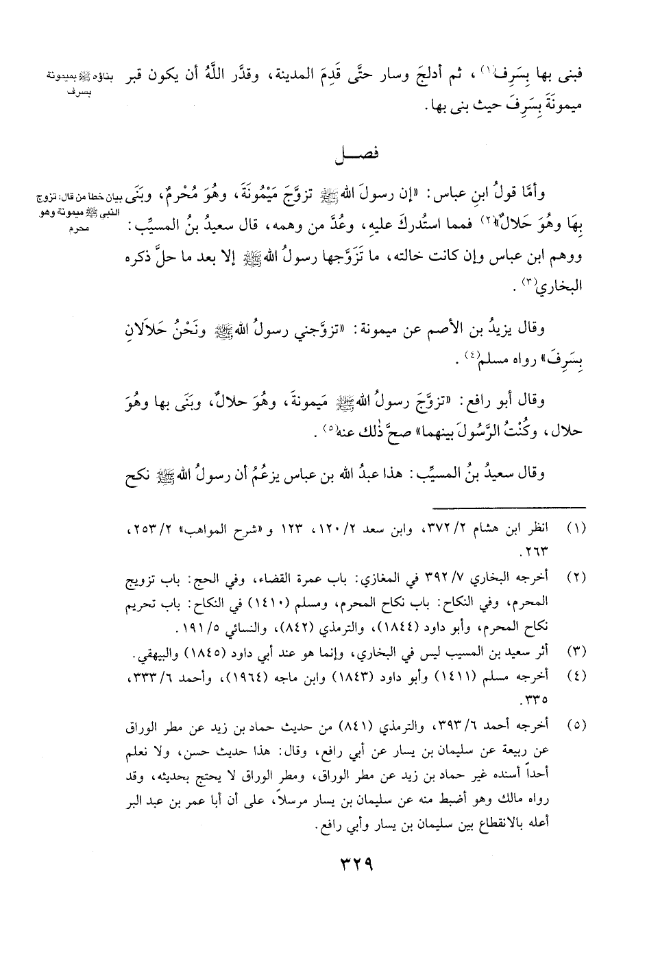وَقَالَ يَزِيدُ بْنُ الْأَصَمِّ عَنْ ميمونة: " «تَزَوَّجَنِي رَسُولُ اللَّهِ - صَلَّى اللَّهُ عَلَيْهِ وَسَلَّمَ - وَنَحْنُ حَلَالَانِ بِسَرِفَ» " رَوَاهُ مسلم.