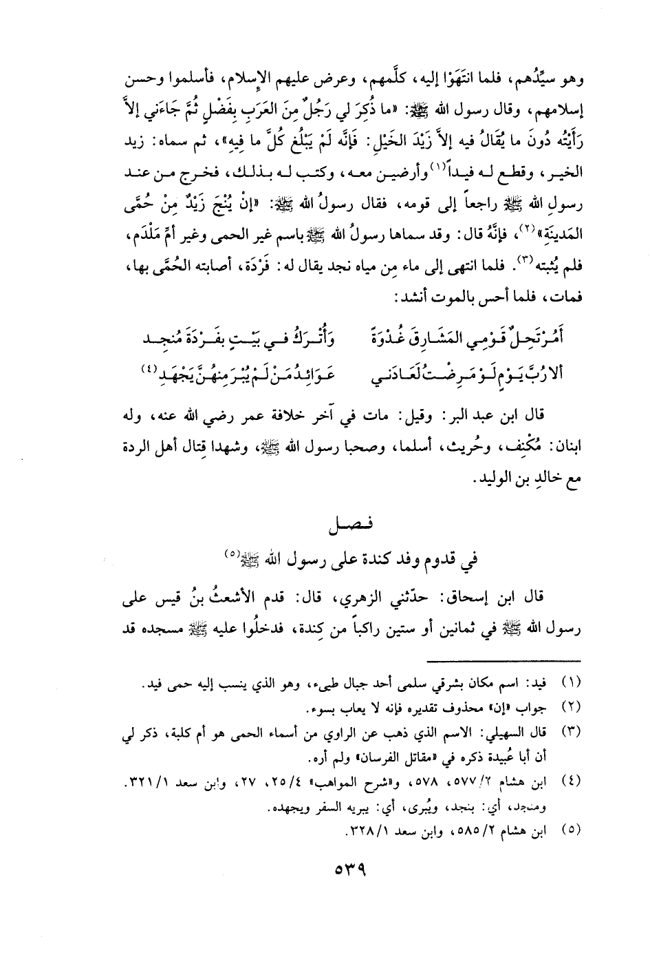 وَهُوَ سَيِّدُهُمْ، فَلَمَّا انْتَهَوْا إِلَيْهِ، كَلَّمَهُمْ وَعَرَضَ عَلَيْهِمُ الْإِسْلَامَ، فَأَسْلَمُوا وَحَسُنَ إِسْلَامُهُمْ، وَقَالَ رَسُولُ اللَّهِ - صَلَّى اللَّهُ عَلَيْهِ وَسَلَّمَ: ( «مَا ذُكِرَ لِي رَجُلٌ مِنَ الْعَرَبِ بِفَضْلٍ ثُمَّ جَاءَنِي إِلَّا رَأَيْتُهُ دُونَ مَا يُقَالُ فِيهِ إِلَّا زيد الخيل: فَإِنَّهُ لَمْ يَبْلُغْ كُلَّ مَا فِيهِ» ) ، ثُمَّ سَمَّاهُ: زيد الخير، وَقَطَعَ لَهُ فَيْدًا وَأَرَضِينَ مَعَهُ، وَكَتَبَ لَهُ بِذَلِكَ، فَخَرَجَ مِنْ عِنْدِ رَسُولِ اللَّهِ - صَلَّى اللَّهُ عَلَيْهِ وَسَلَّمَ - رَاجِعًا إِلَى قَوْمِهِ، فَقَالَ رَسُولُ اللَّهِ - صَلَّى اللَّهُ عَلَيْهِ وَسَلَّمَ: ( «إِنْ يُنْجَ زيد مِنْ حُمَّى الْمَدِينَةِ» ) ، فَإِنَّهُ قَالَ: وَقَدْ سَمَّاهَا رَسُولُ اللَّهِ - صَلَّى اللَّهُ عَلَيْهِ وَسَلَّمَ - بِاسْمٍ غَيْرِ الْحُمَّى وَغَيْرِ أُمِّ مِلْدَمٍ، فَلَمْ يُثْبِتْهُ. فَلَمَّا انْتَهَى إِلَى مَاءٍ مِنْ مِيَاهِ نَجْدٍ يُقَالُ لَهُ فَرْدَةُ، أَصَابَتْهُ الْحُمَّى بِهَا فَمَاتَ، فَلَمَّا أَحَسَّ بِالْمَوْتِ أَنْشَدَ: