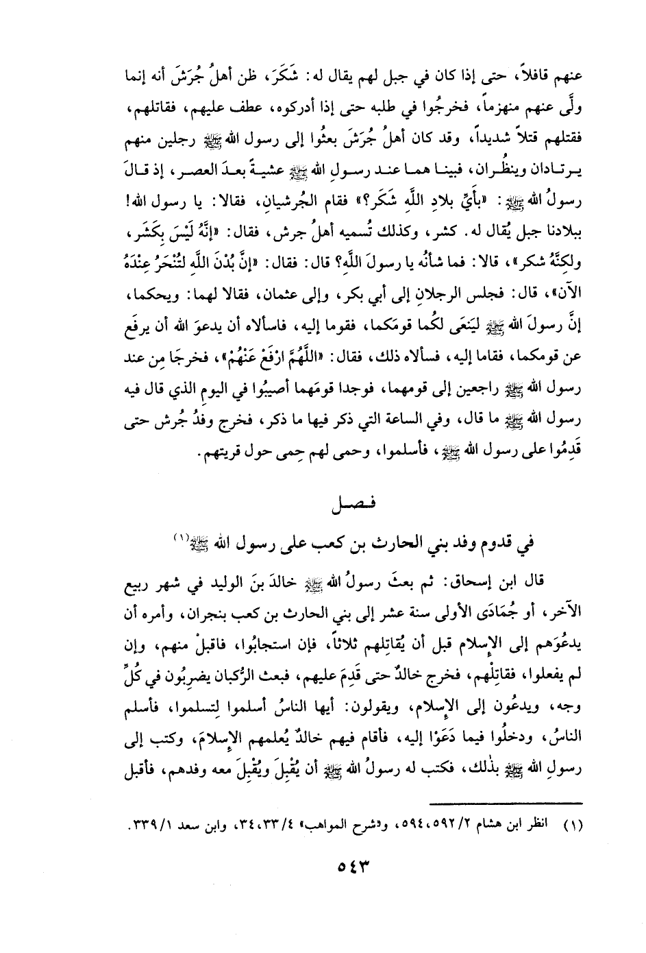 عَنْهُمْ قَافِلًا، حَتَّى إِذَا كَانَ فِي جَبَلٍ لَهُمْ يُقَالُ لَهُ: شَكَرَ، ظَنَّ أَهْلُ جُرَشَ أَنَّهُ إِنَّمَا وَلَّى عَنْهُمْ مُنْهَزِمًا، فَخَرَجُوا فِي طَلَبِهِ حَتَّى إِذَا أَدْرَكُوهُ، عَطَفَ عَلَيْهِمْ فَقَاتَلَهُمْ، فَقَتَلَهُمْ قَتْلًا شَدِيدًا، وَقَدْ كَانَ أَهْلُ جُرَشَ بَعَثُوا إِلَى رَسُولِ اللَّهِ - صَلَّى اللَّهُ عَلَيْهِ وَسَلَّمَ - رَجُلَيْنِ مِنْهُمْ يَرْتَادَانِ وَيَنْظُرَانِ، فَبَيْنَا هُمَا عِنْدَ رَسُولِ اللَّهِ - صَلَّى اللَّهُ عَلَيْهِ وَسَلَّمَ - عَشِيَّةً بَعْدَ الْعَصْرِ، إِذْ قَالَ رَسُولُ اللَّهِ - صَلَّى اللَّهُ عَلَيْهِ وَسَلَّمَ: (بِأَيِّ بِلَادِ اللَّهِ شَكَرُ؟ "، فَقَامَ الْجُرَشِيَّانِ، فَقَالَا: يَا رَسُولَ اللَّهِ! بِبِلَادِنَا جَبَلٌ يُقَالُ لَهُ. كَشَرُ، وَكَذَلِكَ تُسَمِّيهِ أَهْلُ جُرَشَ، فَقَالَ: " إِنَّهُ لَيْسَ " بِكَشَرَ، وَلَكِنَّهُ شَكَرُ "، قَالَا: فَمَا شَأْنُهُ يَا رَسُولَ اللَّهِ؟ قَالَ: فَقَالَ: " إِنَّ بُدْنَ اللَّهِ لَتُنْحَرُ عِنْدَهُ الْآنَ "، قَالَ: فَجَلَسَ الرَّجُلَانِ إِلَى أبي بكر، وَإِلَى عثمان، فَقَالَا لَهُمَا: وَيْحَكُمَا، إِنَّ رَسُولَ اللَّهِ - صَلَّى اللَّهُ عَلَيْهِ وَسَلَّمَ - لَيَنْعَى لَكُمَا قَوْمَكُمَا، فَقُومَا إِلَيْهِ، فَاسْأَلَاهُ أَنْ يَدْعُوَ اللَّهَ أَنْ يَرْفَعَ عَنْ قَوْمِكُمَا، فَقَامَا إِلَيْهِ فَسَأَلَاهُ ذَلِكَ، فَقَالَ: " اللَّهُمَّ ارْفَعْ عَنْهُمْ "، فَخَرَجَا مِنْ عِنْدِ رَسُولِ اللَّهِ - صَلَّى اللَّهُ عَلَيْهِ وَسَلَّمَ - رَاجِعَيْنِ إِلَى قَوْمِهِمَا، فَوَجَدَا قَوْمَهُمَا أُصِيبُوا فِي الْيَوْمِ الَّذِي قَالَ فِيهِ رَسُولُ اللَّهِ - صَلَّى اللَّهُ عَلَيْهِ وَسَلَّمَ - مَا قَالَ، وَفِي السَّاعَةِ الَّتِي ذَكَرَ فِيهَا مَا ذَكَرَ، فَخَرَجَ وَفْدُ جُرَشَ حَتَّى قَدِمُوا عَلَى رَسُولِ اللَّهِ - صَلَّى اللَّهُ عَلَيْهِ وَسَلَّمَ - فَأَسْلَمُوا، وَحَمَى لَهُمْ حِمًى حَوْلَ قَرْيَتِهِمْ» .