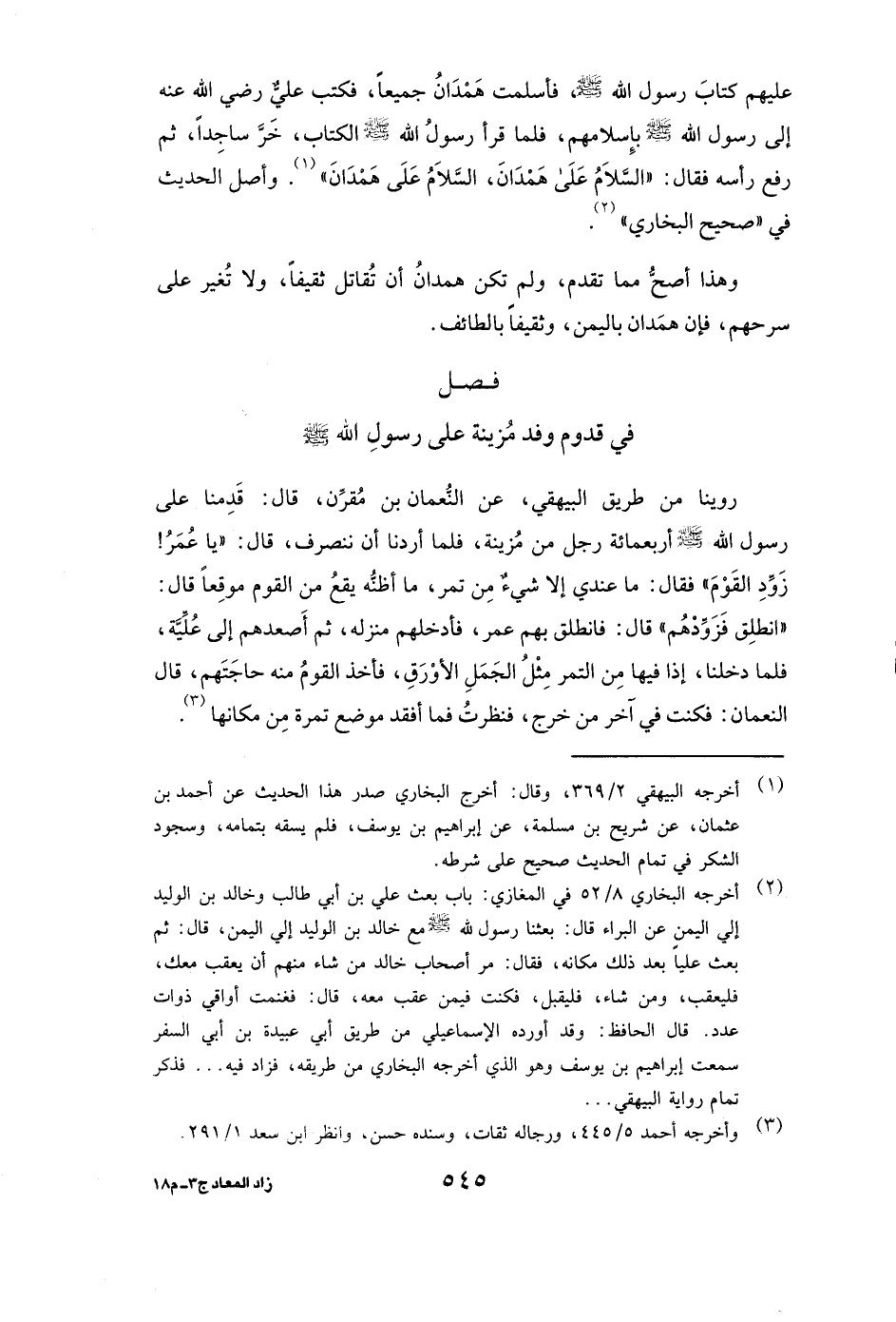 عَلَيْهِمْ كِتَابَ رَسُولِ اللَّهِ - صَلَّى اللَّهُ عَلَيْهِ وَسَلَّمَ، فَأَسْلَمَتْ هَمْدَانُ جَمِيعًا، فَكَتَبَ علي - رَضِيَ اللَّهُ عَنْهُ - إِلَى رَسُولِ اللَّهِ - صَلَّى اللَّهُ عَلَيْهِ وَسَلَّمَ - بِإِسْلَامِهِمْ، فَلَمَّا قَرَأَ رَسُولُ اللَّهِ - صَلَّى اللَّهُ عَلَيْهِ وَسَلَّمَ - الْكِتَابَ خَرَّ سَاجِدًا، ثُمَّ رَفَعَ رَأْسَهُ، فَقَالَ: (السَّلَامُ عَلَى هَمْدَانَ، السَّلَامُ عَلَى هَمْدَانَ) » . وَأَصْلُ الْحَدِيثِ فِي " صَحِيحِ الْبُخَارِيِّ ".