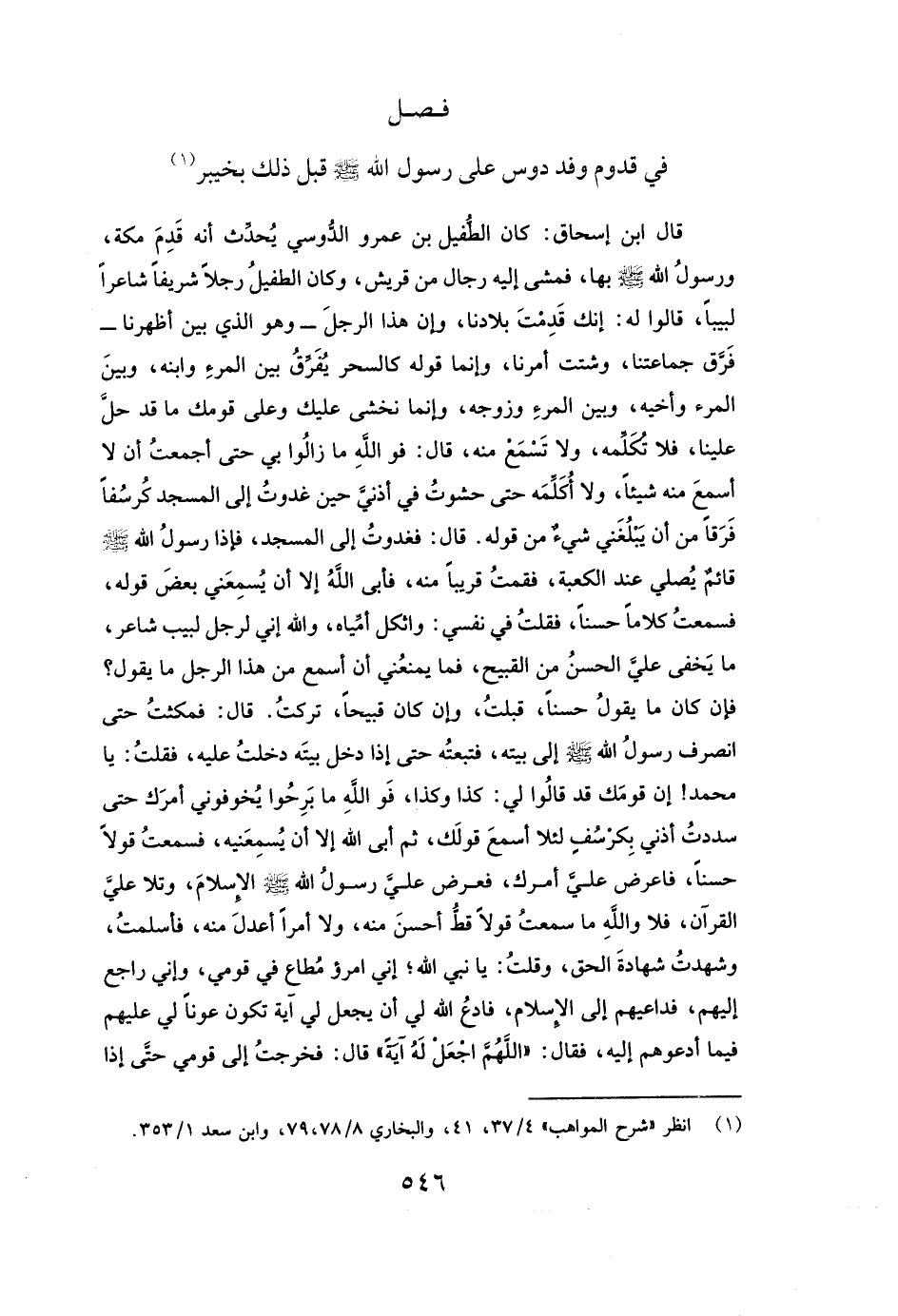 قَالَ ابْنُ إِسْحَاقَ: كَانَ الطُّفَيْلُ بْنُ عَمْرٍو الدَّوْسِيُّ يُحَدِّثُ أَنَّهُ قَدِمَ مَكَّةَ، وَرَسُولُ اللَّهِ - صَلَّى اللَّهُ عَلَيْهِ وَسَلَّمَ - بِهَا، فَمَشَى إِلَيْهِ رِجَالٌ مِنْ قُرَيْشٍ، وَكَانَ الطفيل رَجُلًا شَرِيفًا شَاعِرًا لَبِيبًا، قَالُوا لَهُ: إِنَّكَ قَدِمْتَ بِلَادَنَا، وَإِنَّ هَذَا الرَّجُلَ - وَهُوَ الَّذِي بَيْنَ أَظْهُرِنَا - فَرَّقَ جَمَاعَتَنَا، وَشَتَّتَ أَمْرَنَا، وَإِنَّمَا قَوْلُهُ كَالسِّحْرِ يُفَرِّقُ بَيْنَ الْمَرْءِ وَابْنِهِ، وَبَيْنَ الْمَرْءِ وَأَخِيهِ، وَبَيْنَ الْمَرْءِ وَزَوْجِهِ، وَإِنَّمَا نَخْشَى عَلَيْكَ وَعَلَى قَوْمِكَ مَا قَدْ حَلَّ عَلَيْنَا، فَلَا تُكَلِّمْهُ وَلَا تَسْمَعْ مِنْهُ، قَالَ: فَوَاللَّهِ مَا زَالُوا بِي حَتَّى أَجْمَعْتُ أَنْ لَا أَسْمَعَ مِنْهُ شَيْئًا، وَلَا أُكَلِّمَهُ حَتَّى حَشَوْتُ فِي أُذُنَيَّ حِينَ غَدَوْتُ إِلَى الْمَسْجِدِ كُرْسُفًا، فَرَقًا مِنْ أَنْ يَبْلُغَنِي شَيْءٌ مِنْ قَوْلِهِ.