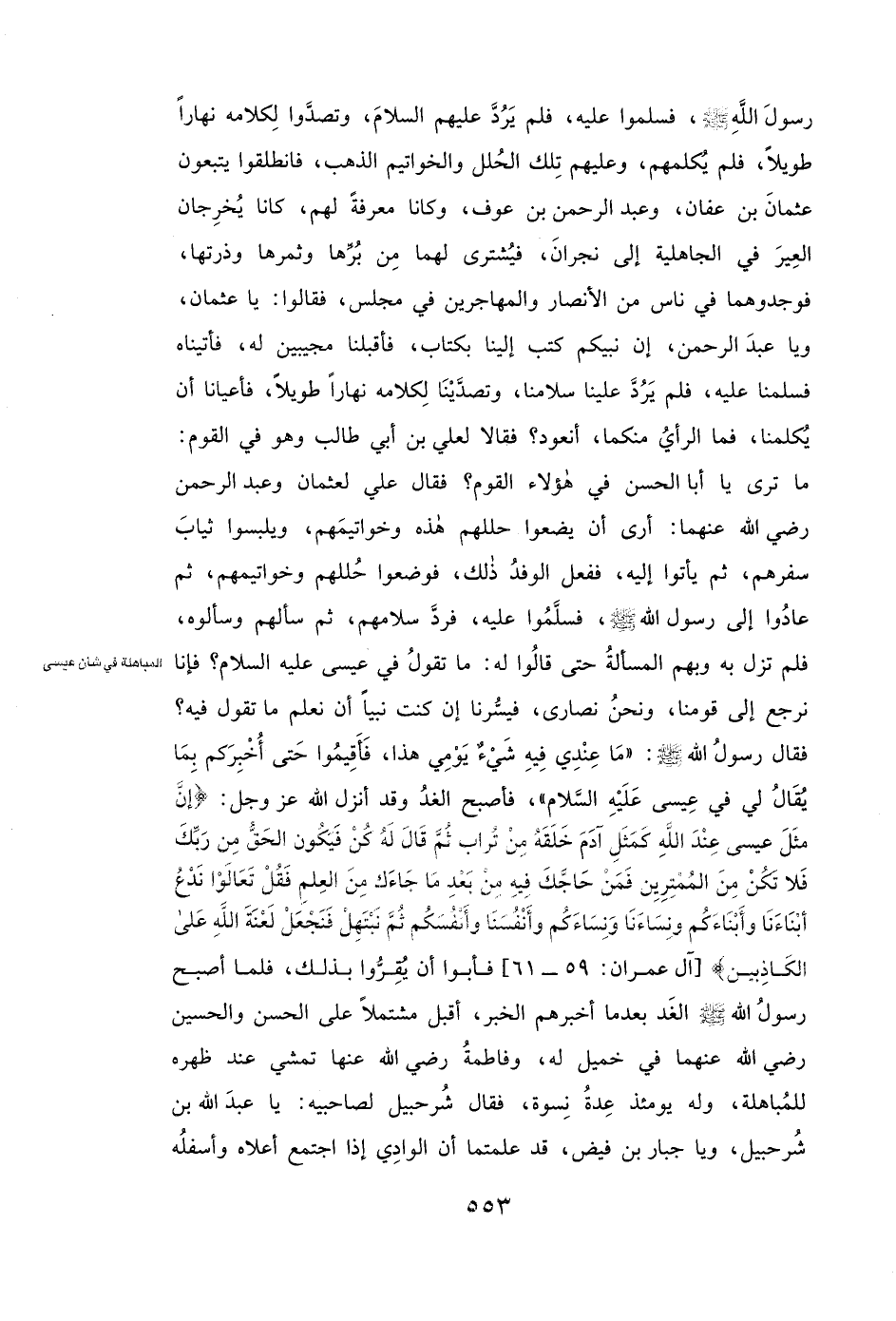 رَسُولَ اللَّهِ - صَلَّى اللَّهُ عَلَيْهِ وَسَلَّمَ - فَسَلَّمُوا عَلَيْهِ، فَلَمْ يَرُدَّ عَلَيْهِمُ السَّلَامَ، وَتَصَدَّوْا لِكَلَامِهِ نَهَارًا طَوِيلًا، فَلَمْ يُكَلِّمْهُمْ، وَعَلَيْهِمْ تِلْكَ الْحُلَلُ وَالْخَوَاتِيمُ الذَّهَبُ، فَانْطَلَقُوا يَتْبَعُونَ عُثْمَانَ بْنَ عَفَّانَ، وَعَبْدَ الرَّحْمَنِ بْنَ عَوْفٍ، وَكَانَا مَعْرِفَةً لَهُمْ، كَانَا يُخْرِجَانِ الْعِيرَ فِي الْجَاهِلِيَّةِ إِلَى نَجْرَانَ، فَيُشْتَرَى لَهُمَا مِنْ بُرِّهَا وَثَمَرِهَا وَذُرَتِهَا، فَوَجَدُوهُمَا فِي نَاسٍ مِنَ الْأَنْصَارِ وَالْمُهَاجِرِينَ فِي مَجْلِسٍ، فَقَالُوا: يَا عثمان، وَيَا عبد الرحمن، إِنَّ نَبِيَّكُمْ كَتَبَ إِلَيْنَا بِكِتَابٍ، فَأَقْبَلْنَا مُجِيبِينَ لَهُ، فَأَتَيْنَاهُ فَسَلَّمْنَا عَلَيْهِ، فَلَمْ يَرُدَّ عَلَيْنَا سَلَامَنَا، وَتَصَدَّيْنَا لِكَلَامِهِ نَهَارًا طَوِيلًا، فَأَعْيَانَا أَنْ يُكَلِّمَنَا، فَمَا الرَّأْيُ مِنْكُمَا، أَنَعُودُ؟ فَقَالَا لِعَلِيِّ بْنِ أَبِي طَالِبٍ وَهُوَ فِي الْقَوْمِ: مَا تَرَى يَا أبا الحسن فِي هَؤُلَاءِ الْقَوْمِ؟ فَقَالَ علي لعثمان وعبد الرحمن رَضِيَ اللَّهُ عَنْهُمَا: أَرَى أَنْ يَضَعُوا حُلَلَهُمْ هَذِهِ وَخَوَاتِيمَهُمْ، وَيَلْبَسُوا ثِيَابَ سَفَرِهِمْ، ثُمَّ يَأْتُوا إِلَيْهِ، فَفَعَلَ الْوَفْدُ ذَلِكَ، فَوَضَعُوا حُلَلَهُمْ وَخَوَاتِيمَهُمْ، ثُمَّ عَادُوا إِلَى رَسُولِ اللَّهِ - صَلَّى اللَّهُ عَلَيْهِ وَسَلَّمَ - فَسَلَّمُوا عَلَيْهِ، فَرَدَّ سَلَامَهُمْ، ثُمَّ سَأَلَهُمْ وَسَأَلُوهُ، فَلَمْ تَزَلْ بِهِ وَبِهِمُ الْمَسْأَلَةُ حَتَّى قَالُوا لَهُ: «مَا تَقُولُ فِي عِيسَى عَلَيْهِ السَّلَامُ؟ فَإِنَّا نَرْجِعُ إِلَى قَوْمِنَا وَنَحْنُ نَصَارَى، فَيَسُرُّنَا إِنْ كُنْتَ نَبِيًّا أَنْ نَعْلَمَ مَا تَقُولُ فِيهِ؟