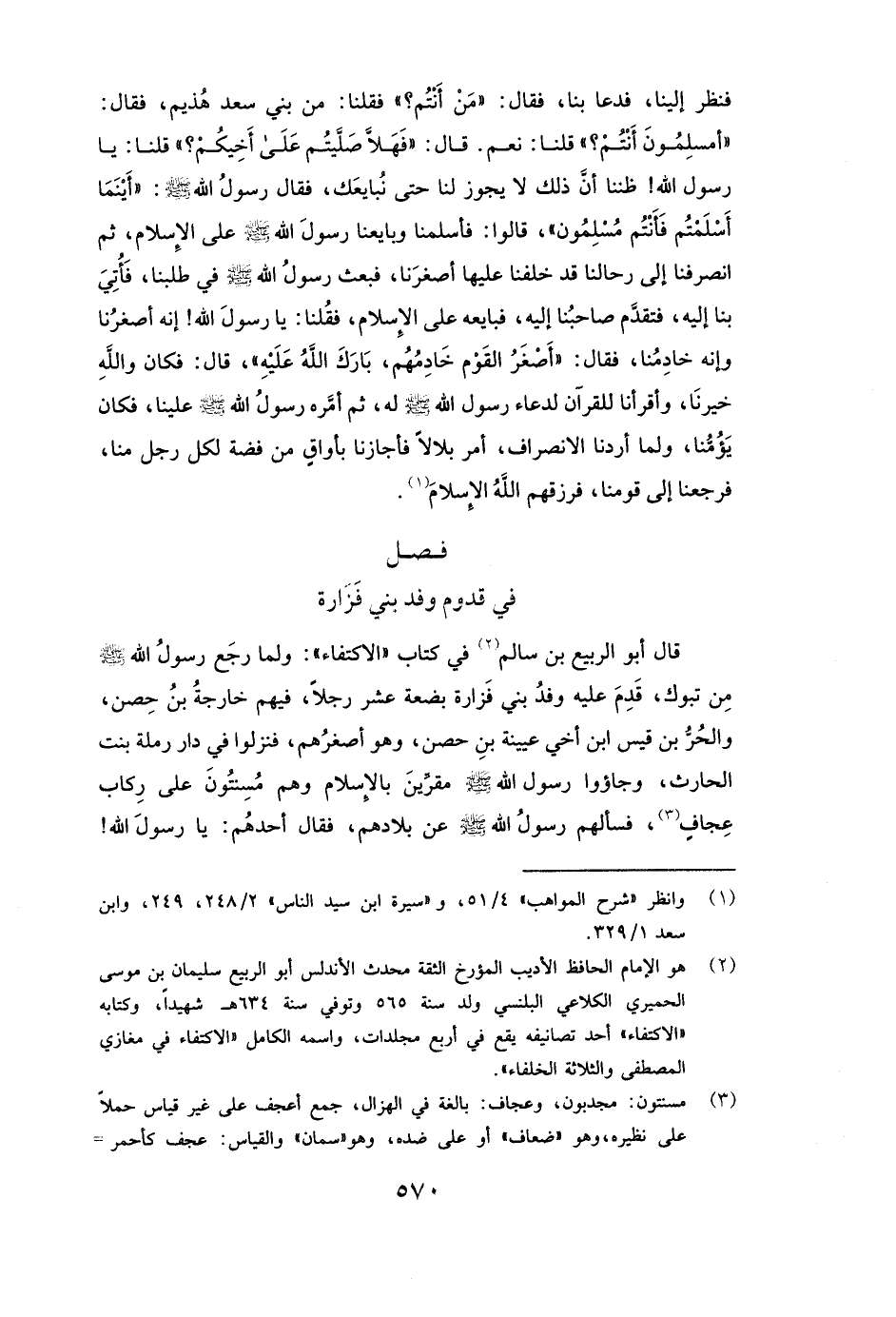 قَالَ أَبُو الرَّبِيعِ بْنُ سَالِمٍ فِي كِتَابِ " الِاكْتِفَاءِ ": وَلَمَّا رَجَعَ رَسُولُ اللَّهِ صَلَّى اللَّهُ عَلَيْهِ وَسَلَّمَ مِنْ تَبُوكَ، قَدِمَ عَلَيْهِ وَفْدُ بَنِي فَزَارَةَ بِضْعَةَ عَشَرَ رَجُلًا، فِيهِمْ خارجة بن حصن، والحر بن قيس ابْنُ أَخِي عيينة بن حصن، وَهُوَ أَصْغَرُهُمْ، فَنَزَلُوا فِي دَارِ رملة بنت الحارث، وَجَاءُوا رَسُولَ اللَّهِ صَلَّى اللَّهُ عَلَيْهِ وَسَلَّمَ مُقِرِّينَ بِالْإِسْلَامِ، وَهُمْ مُسْنِتُونَ عَلَى رِكَابٍ عِجَافٍ، فَسَأَلَهُمْ رَسُولُ اللَّهِ صَلَّى اللَّهُ عَلَيْهِ وَسَلَّمَ عَنْ بِلَادِهِمْ، فَقَالَ أَحَدُهُمْ: يَا رَسُولَ اللَّهِ