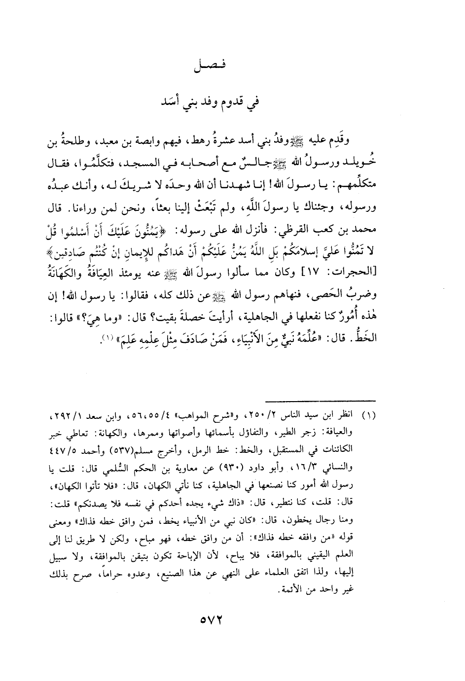 وَقَدِمَ عَلَيْهِ صَلَّى اللَّهُ عَلَيْهِ وَسَلَّمَ وَفْدُ بَنِي أَسَدٍ عَشَرَةُ رَهْطٍ، فِيهِمْ وابصة بن معبد، وطلحة بن خويلد، وَرَسُولُ اللَّهِ صَلَّى اللَّهُ عَلَيْهِ وَسَلَّمَ جَالِسٌ مَعَ أَصْحَابِهِ فِي الْمَسْجِدِ، فَتَكَلَّمُوا فَقَالَ مُتَكَلِّمُهُمْ: يَا رَسُولَ اللَّهِ، إِنَّا شَهِدْنَا أَنَّ اللَّهَ وَحْدَهُ لَا شَرِيكَ لَهُ، وَأَنَّكَ عَبْدُهُ وَرَسُولُهُ، وَجِئْنَاكَ يَا رَسُولَ اللَّهِ، وَلَمْ تَبْعَثْ إِلَيْنَا بَعْثًا، وَنَحْنُ لِمَنْ وَرَاءَنَا. قَالَ مُحَمَّدُ بْنُ كَعْبٍ الْقُرَظِيُّ: فَأَنْزَلَ اللَّهُ عَلَى رَسُولِهِ {يَمُنُّونَ عَلَيْكَ أَنْ أَسْلَمُوا قُلْ لَا تَمُنُّوا عَلَيَّ إِسْلَامَكُمْ بَلِ اللَّهُ يَمُنُّ عَلَيْكُمْ أَنْ هَدَاكُمْ لِلْإِيمَانِ إِنْ كُنْتُمْ صَادِقِينَ} [الحجرات: 17] [الْحُجُرَاتِ: 17] وَكَانَ مِمَّا سَأَلُوا رَسُولَ اللَّهِ صَلَّى اللَّهُ عَلَيْهِ وَسَلَّمَ عَنْهُ يَوْمَئِذٍ: الْعِيَافَةُ وَالْكَهَانَةُ وَضَرْبُ الْحَصَى، فَنَهَاهُمْ رَسُولُ اللَّهِ صَلَّى اللَّهُ عَلَيْهِ وَسَلَّمَ عَنْ ذَلِكَ كُلِّهِ فَقَالُوا: «يَا رَسُولَ اللَّهِ إِنَّ هَذِهِ أُمُورٌ كُنَّا نَفْعَلُهَا فِي الْجَاهِلِيَّةِ أَرَأَيْتَ خَصْلَةً بَقِيَتْ؟ قَالَ: " وَمَا هِيَ؟ " قَالُوا: الْخَطُّ. قَالَ: " عُلِّمَهُ نَبِيٌّ مِنَ الْأَنْبِيَاءِ فَمَنْ صَادَفَ مِثْلَ عِلْمِهِ عَلِمَ» ".