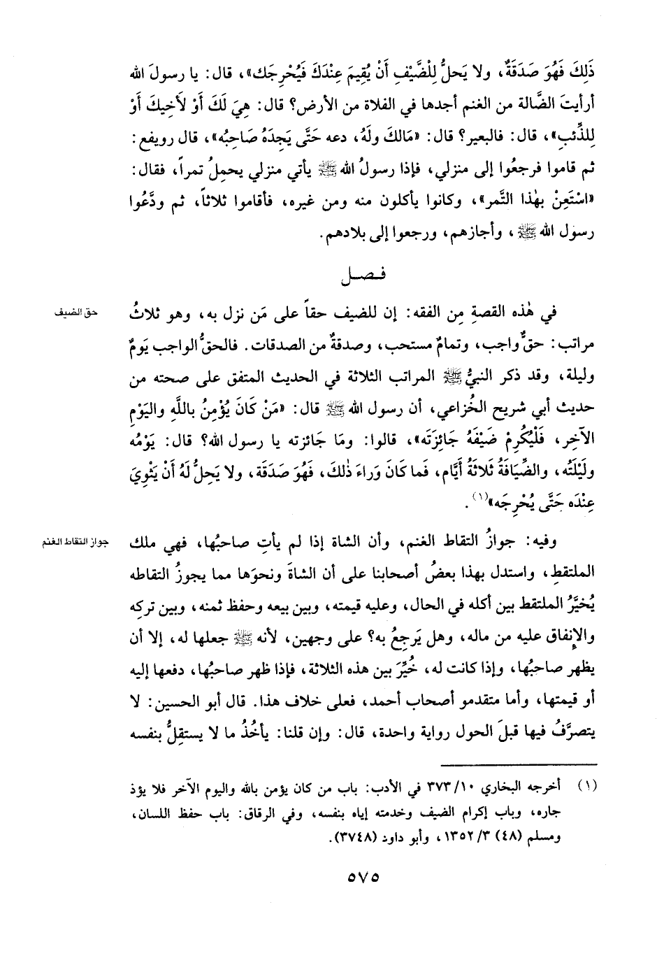 فَالْحَقُّ الْوَاجِبُ يَوْمٌ وَلَيْلَةٌ، وَقَدْ ذَكَرَ النَّبِيُّ صَلَّى اللَّهُ عَلَيْهِ وَسَلَّمَ الْمَرَاتِبَ الثَّلَاثَةَ فِي الْحَدِيثِ الْمُتَّفَقِ عَلَى صِحَّتِهِ مِنْ حَدِيثِ أبي شريح الخزاعي أَنَّ رَسُولَ اللَّهِ صَلَّى اللَّهُ عَلَيْهِ وَسَلَّمَ قَالَ: ( «مَنْ كَانَ يُؤْمِنُ بِاللَّهِ وَالْيَوْمِ الْآخِرِ، فَلْيُكْرِمْ ضَيْفَهُ جَائِزَتَهُ "، قَالُوا: وَمَا جَائِزَتُهُ يَا رَسُولَ اللَّهِ؟ قَالَ: يَوْمُهُ وَلَيْلَتُهُ، وَالضِّيَافَةُ ثَلَاثَةُ أَيَّامٍ، فَمَا كَانَ وَرَاءَ ذَلِكَ فَهُوَ صَدَقَةٌ، وَلَا يَحِلُّ لَهُ أَنْ يَثْوِيَ عِنْدَهُ حَتَى يُحْرِجَهُ» )