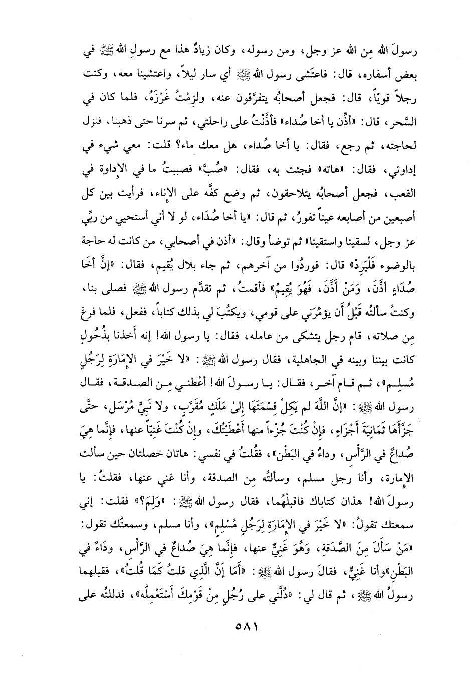 وَكَانَ زياد هَذَا مَعَ رَسُولِ اللَّهِ صَلَّى اللَّهُ عَلَيْهِ وَسَلَّمَ فِي بَعْضِ أَسْفَارِهِ، قَالَ: فَاعْتَشَى رَسُولُ اللَّهِ صَلَّى اللَّهُ عَلَيْهِ وَسَلَّمَ، أَيْ: سَارَ لَيْلًا، وَاعْتَشَيْنَا مَعَهُ، وَكُنْتُ رَجُلًا قَوِيًّا قَالَ: فَجُعِلَ أَصْحَابُهُ يَتَفَرَّقُونَ عَنْهُ، وَلَزِمْتُ غَرْزَهُ، فَلَمَّا كَانَ فِي السَّحَرِ قَالَ: " أَذِّنْ يَا أَخَا صُدَاءٍ " فَأَذَّنْتُ عَلَى رَاحِلَتِي، ثُمَّ سِرْنَا حَتَّى ذَهَبْنَا، فَنَزَلَ لِحَاجَتِهِ ثُمَّ رَجَعَ، فَقَالَ: يَا أَخَا صُدَاءٍ، هَلْ مَعَكَ مَاءٌ؟ قُلْتُ: مَعِي شَيْءٌ فِي إِدَاوَتِي، فَقَالَ " هَاتِهِ " فَجِئْتُ بِهِ، فَقَالَ " صُبَّ " فَصَبَبْتُ مَا فِي الْإِدَاوَةِ فِي الْقَعْبِ، فَجُعِلَ أَصْحَابُهُ يَتَلَاحَقُونَ، ثُمَّ وَضَعَ كَفَّهُ عَلَى الْإِنَاءِ، فَرَأَيْتُ بَيْنَ كُلِّ أُصْبُعَيْنِ مِنْ أَصَابِعِهِ عَيْنًا تَفُورُ، ثُمَّ قَالَ: " يَا أَخَا صُدَاءٍ لَوْلَا أَنِّي أَسْتَحِي مِنْ رَبِّي عَزَّ وَجَلَّ لَسَقَيْنَا وَاسْتَقَيْنَا " ثُمَّ تَوَضَّأَ وَقَالَ: " أَذِّنْ فِي أَصْحَابِي مَنْ كَانَتْ لَهُ حَاجَةٌ بِالْوُضُوءِ فَلْيَرِدْ "، قَالَ: فَوَرَدُوا مِنْ آخِرِهِمْ ثُمَّ جَاءَ بلال يُقِيمُ، فَقَالَ (إِنَّ أَخَا صُدَاءٍ أَذَّنَ، وَمَنْ أَذَّنَ فَهُوَ يُقِيمُ) فَأَقَمْتُ، ثُمَّ تَقَدَّمَ رَسُولُ اللَّهِ صَلَّى اللَّهُ عَلَيْهِ وَسَلَّمَ فَصَلَّى بِنَا، وَكُنْتُ سَأَلْتُهُ قَبْلُ أَنْ يُؤَمِّرَنِي عَلَى قَوْمِي، وَيَكْتُبَ لِي بِذَلِكَ كِتَابًا، فَفَعَلَ. فَلَمَّا فَرَغَ مِنْ صَلَاتِهِ، قَامَ رَجُلٌ يَتَشَكَّى مِنْ عَامِلِهِ، فَقَالَ: يَا رَسُولَ اللَّهِ: إِنَّهُ أَخَذَنَا بِذُحُولٍ كَانَتْ بَيْنَنَا وَبَيْنَهُ فِي الْجَاهِلِيَّةِ، فَقَالَ رَسُولُ اللَّهِ صَلَّى اللَّهُ عَلَيْهِ وَسَلَّمَ: (لَا خَيْرَ فِي الْإِمَارَةِ لِرَجُلٍ مُسْلِمٍ) ثُمَّ قَامَ آخَرُ فَقَالَ: يَا رَسُولَ اللَّهِ أَعْطِنِي مِنَ الصَّدَقَةِ، فَقَالَ رَسُولُ اللَّهِ صَلَّى اللَّهُ عَلَيْهِ وَسَلَّمَ: " إِنَّ اللَّهَ لَمْ يَكِلْ قِسْمَتَهَا إِلَى مَلَكٍ مُقَرَّبٍ وَلَا نَبِيٍّ مُرْسَلٍ، حَتَّى جَزَّأَهَا ثَمَانِيَةَ أَجْزَاءٍ، فَإِنْ كُنْتَ جُزْءًا مِنْهَا أَعْطَيْتُكَ، وَإِنْ كُنْتَ غَنِيًّا عَنْهَا، فَإِنَّمَا هِيَ صُدَاعٌ فِي الرَّأْسِ وَدَاءٌ فِي الْبَطْنِ " فَقُلْتُ فِي نَفْسِي: هَاتَانِ خَصْلَتَانِ حِينَ سَأَلْتُ الْإِمَارَةَ وَأَنَا رَجُلٌ مُسْلِمٌ، وَسَأَلْتُهُ مِنَ الصَّدَقَةِ وَأَنَا غَنِيٌّ عَنْهَا، فَقُلْتُ: يَا رَسُولَ اللَّهِ، هَذَانِ كِتَابَاكَ فَاقْبَلْهُمَا. فَقَالَ رَسُولُ اللَّهِ صَلَّى اللَّهُ عَلَيْهِ وَسَلَّمَ: " وَلِمَ؟ " فَقُلْتُ: إِنِّي سَمِعْتُكَ تَقُولُ: (لَا خَيْرَ فِي الْإِمَارَةِ لِرَجُلٍ مُسْلِمٍ) وَأَنَا مُسْلِمٌ، وَسَمِعْتُكَ تَقُولُ: (مَنْ سَأَلَ مِنَ الصَّدَقَةِ وَهُوَ غَنِيٌّ عَنْهَا فَإِنَّمَا هِيَ صُدَاعٌ فِي الرَّأْسِ وَدَاءٌ فِي الْبَطْنِ) وَأَنَا غَنِيٌّ، فَقَالَ رَسُولُ اللَّهِ صَلَّى اللَّهُ عَلَيْهِ وَسَلَّمَ: " أَمَا إِنَّ الَّذِي قُلْتَ كَمَا قُلْتَ " فَقَبِلَهُمَا رَسُولُ اللَّهِ صَلَّى اللَّهُ عَلَيْهِ وَسَلَّمَ، ثُمَّ قَالَ لِي: " دُلَّنِي عَلَى رَجُلٍ مِنْ قَوْمِكَ أَسْتَعْمِلُهُ " فَدَلَلْتُهُ عَلَى
