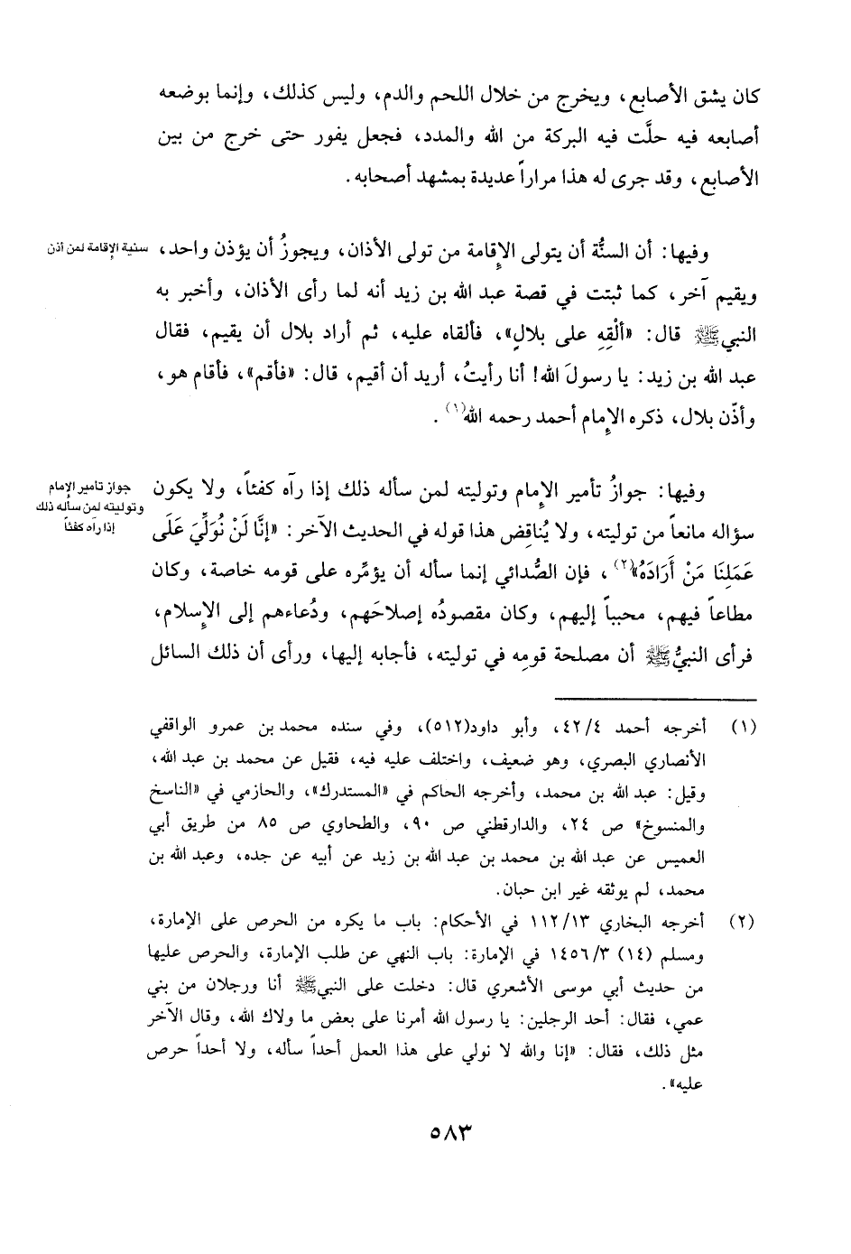 وَفِيهَا: جَوَازُ تَأْمِيرِ الْإِمَامِ وَتَوْلِيَتِهِ لِمَنْ سَأَلَهُ ذَلِكَ إِذَا رَآهُ كُفْئًا، وَلَا يَكُونُ سُؤَالُهُ مَانِعًا مِنْ تَوْلِيَتِهِ، وَلَا يُنَاقِضُ هَذَا قَوْلَهُ فِي الْحَدِيثِ الْآخَرِ: ( «إِنَّا لَنْ نُوَلِّيَ عَلَى عَمَلِنَا مَنْ أَرَادَهُ» ) فَإِنَّ الصُّدَائِيَّ إِنَّمَا سَأَلَهُ أَنْ يُؤَمِّرَهُ عَلَى قَوْمِهِ خَاصَّةً، وَكَانَ مُطَاعًا فِيهِمْ مُحَبَّبًا إِلَيْهِمْ، وَكَانَ مَقْصُودُهُ إِصْلَاحَهُمْ وَدُعَاءَهُمْ إِلَى الْإِسْلَامِ، فَرَأَى النَّبِيُّ صَلَّى اللَّهُ عَلَيْهِ وَسَلَّمَ أَنَّ مَصْلَحَةَ قَوْمِهِ فِي تَوْلِيَتِهِ فَأَجَابَهُ إِلَيْهَا وَرَأَى أَنَّ ذَلِكَ السَّائِلَ