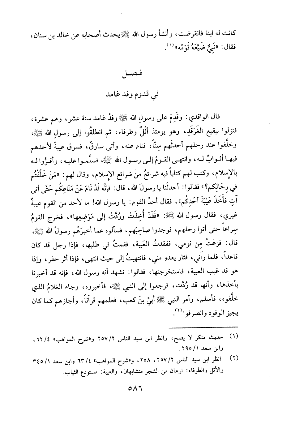 قَالَ الْوَاقِدِيُّ: وَقَدِمَ عَلَى رَسُولِ اللَّهِ صَلَّى اللَّهُ عَلَيْهِ وَسَلَّمَ وَفْدُ غَامِدٍ سَنَةَ عَشْرٍ وَهُمْ عَشَرَةٌ، فَنَزَلُوا بِبَقِيعِ الْغَرْقَدِ، وَهُوَ يَوْمَئِذٍ أَثْلٌ وَطَرْفَاءُ، ثُمَّ انْطَلَقُوا إِلَى رَسُولِ اللَّهِ صَلَّى اللَّهُ عَلَيْهِ وَسَلَّمَ وَخَلَّفُوا عِنْدَ رَحْلِهِمْ أَحْدَثَهُمْ سِنًّا، فَنَامَ عَنْهُ وَأَتَى سَارِقٌ، فَسَرَقَ عَيْبَةً لِأَحَدِهِمْ فِيهَا أَثْوَابٌ لَهُ، وَانْتَهَى الْقَوْمُ إِلَى رَسُولِ اللَّهِ صَلَّى اللَّهُ عَلَيْهِ وَسَلَّمَ، فَسَلَّمُوا عَلَيْهِ وَأَقَرُّوا لَهُ بِالْإِسْلَامِ، وَكَتَبَ لَهُمْ كِتَابًا فِيهِ شَرَائِعُ مِنْ شَرَائِعِ الْإِسْلَامِ، وَقَالَ لَهُمْ: ( «مَنْ خَلَّفْتُمْ فِي رِحَالِكُمْ؟ " فَقَالُوا: أَحْدَثَنَا يَا رَسُولَ اللَّهِ، قَالَ: فَإِنَّهُ قَدْ نَامَ عَنْ مَتَاعِكُمْ حَتَّى أَتَى آتٍ فَأَخَذَ عَيْبَةَ أَحَدِكُمْ " فَقَالَ أَحَدُ الْقَوْمِ: يَا رَسُولَ اللَّهِ، مَا لِأَحَدٍ مِنَ الْقَوْمِ عَيْبَةٌ غَيْرِي، فَقَالَ رَسُولُ اللَّهِ صَلَّى اللَّهُ عَلَيْهِ وَسَلَّمَ: " فَقَدْ أُخِذَتْ وَرُدَّتْ إِلَى مَوْضِعِهَا " فَخَرَجَ الْقَوْمُ سِرَاعًا، حَتَّى أَتَوْا رَحْلَهُمْ، فَوَجَدُوا صَاحِبَهُمْ، فَسَأَلُوهُ عَمَّا أَخْبَرَهُمْ رَسُولُ اللَّهِ صَلَّى اللَّهُ عَلَيْهِ وَسَلَّمَ، قَالَ: فَزِعْتُ مِنْ نَوْمِي، فَفَقَدْتُ الْعَيْبَةَ، فَقُمْتُ فِي طَلَبِهَا، فَإِذَا رَجُلٌ قَدْ كَانَ قَاعِدًا، فَلَمَّا رَآنِي، فَثَارَ يَعْدُو مِنِّي فَانْتَهَيْتُ إِلَى حَيْثُ انْتَهَى فَإِذَا أَثَرُ حَفْرٍ، وَإِذَا هُوَ قَدْ غَيَّبَ الْعَيْبَةَ، فَاسْتَخْرَجْتُهَا، فَقَالُوا: نَشْهَدُ أَنَّهُ رَسُولُ اللَّهِ، فَإِنَّهُ قَدْ أَخْبَرَنَا بِأَخْذِهَا، وَأَنَّهَا قَدْ رُدَّتْ. فَرَجَعُوا إِلَى النَّبِيِّ صَلَّى اللَّهُ عَلَيْهِ وَسَلَّمَ فَأَخْبَرُوهُ، وَجَاءَ الْغُلَامُ الَّذِي خَلَّفُوهُ فَأَسْلَمَ» ) وَأَمَرَ النَّبِيُّ صَلَّى اللَّهُ عَلَيْهِ وَسَلَّمَ أُبَيَّ بْنَ كَعْبٍ فَعَلَّمَهُمْ قُرْآنًا، وَأَجَازَهُمْ كَمَا كَانَ يُجِيزُ الْوُفُودَ وَانْصَرَفُوا.