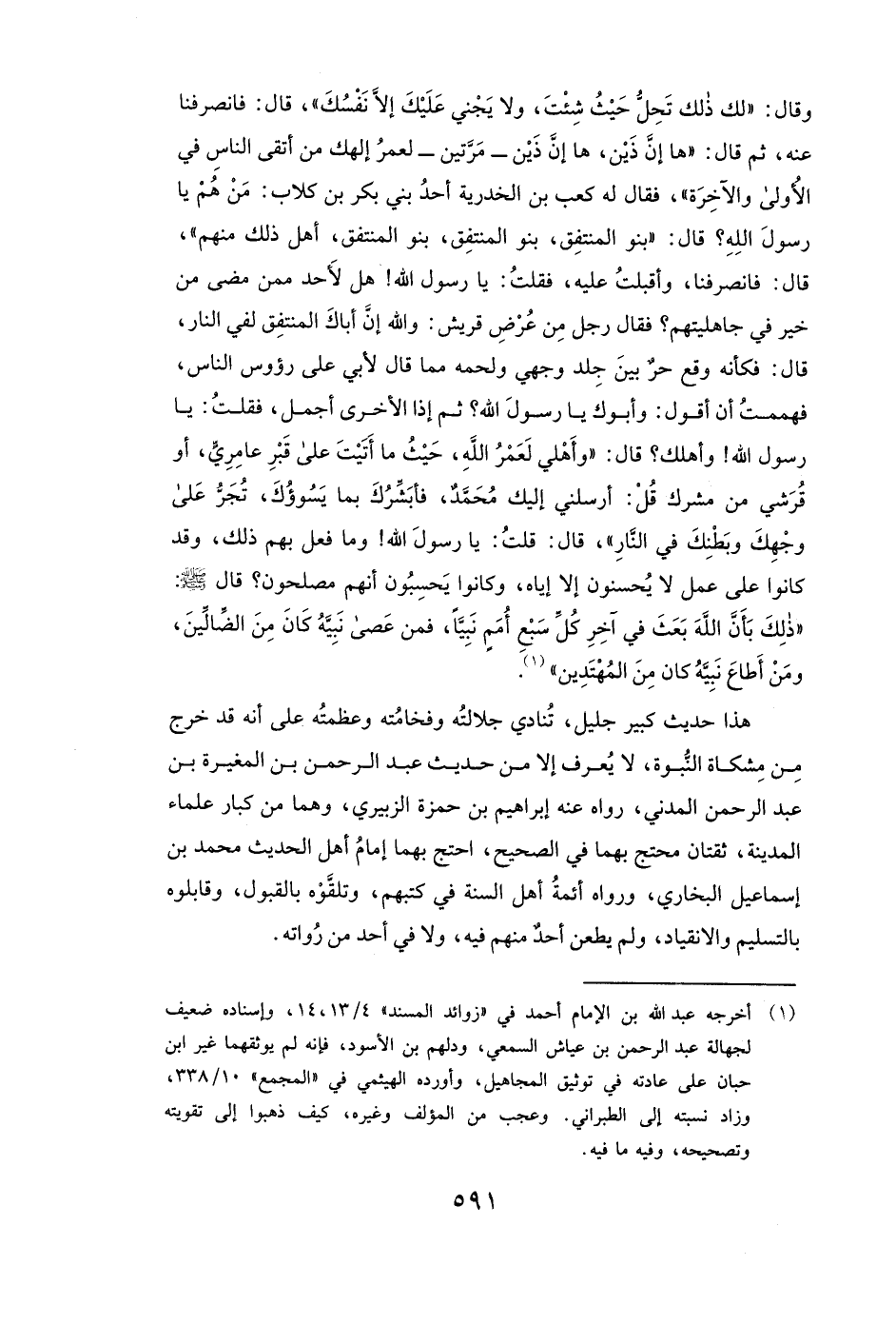 وَقَالَ: " لَكَ ذَلِكَ تَحِلُّ حَيْثُ شِئْتَ وَلَا يَجْنِي عَلَيْكَ إِلَّا نَفْسُكَ " قَالَ: فَانْصَرَفْنَا عَنْهُ ثُمَّ قَالَ: " هَا إِنَّ ذَيْنَ هَا إِنَّ ذَيْنَ - مَرَّتَيْنِ - لَعَمْرُ إِلَهِكَ مَنْ أَتْقَى النَّاسِ فِي الْأُولَى وَالْآخِرَةِ " فَقَالَ لَهُ كعب بن الخدرية - أَحَدُ بَنِي بَكْرِ بْنِ كِلَابٍ -: مَنْ هُمْ يَا رَسُولَ اللَّهِ؟ قَالَ: " بَنُو الْمُنْتَفِقِ بَنُو الْمُنْتَفِقِ بَنُو الْمُنْتَفِقِ، أَهْلُ ذَلِكَ مِنْهُمْ "، قَالَ: فَانْصَرَفْنَا وَأَقْبَلْتُ عَلَيْهِ فَقُلْتُ: يَا رَسُولَ اللَّهِ هَلْ لِأَحَدٍ مِمَّنْ مَضَى مِنْ خَيْرٍ فِي جَاهِلِيَّتِهِمْ؟ فَقَالَ رَجُلٌ مِنْ عُرْضِ قُرَيْشٍ: وَاللَّهِ إِنَّ أَبَاكَ الْمُنْتَفِقَ لَفِي النَّارِ، قَالَ: فَكَأَنَّهُ وَقَعَ حَرٌّ بَيْنَ جِلْدِ وَجْهِي وَلَحْمِهِ مِمَّا قَالَ لِأَبِي عَلَى رُءُوسِ النَّاسِ فَهَمَمْتُ أَنْ أَقُولَ: وَأَبُوكَ يَا رَسُولَ اللَّهِ؟ ثُمَّ إِذَا الْأُخْرَى أَجْمَلُ، فَقُلْتُ: يَا رَسُولَ اللَّهِ وَأَهْلُكَ؟ قَالَ: " وَأَهْلِي لَعَمْرُ اللَّهِ حَيْثُ مَا أَتَيْتَ عَلَى قَبْرِ عَامِرِيٍّ، أَوْ قُرَشِيٍّ مِنْ مُشْرِكٍ قُلْ: أَرْسَلَنِي إِلَيْكَ مُحَمَّدٌ، فَأُبَشِّرُكَ بِمَا يَسُوءُكَ، تُجَرُّ عَلَى وَجْهِكَ وَبَطْنِكَ فِي النَّارِ ".