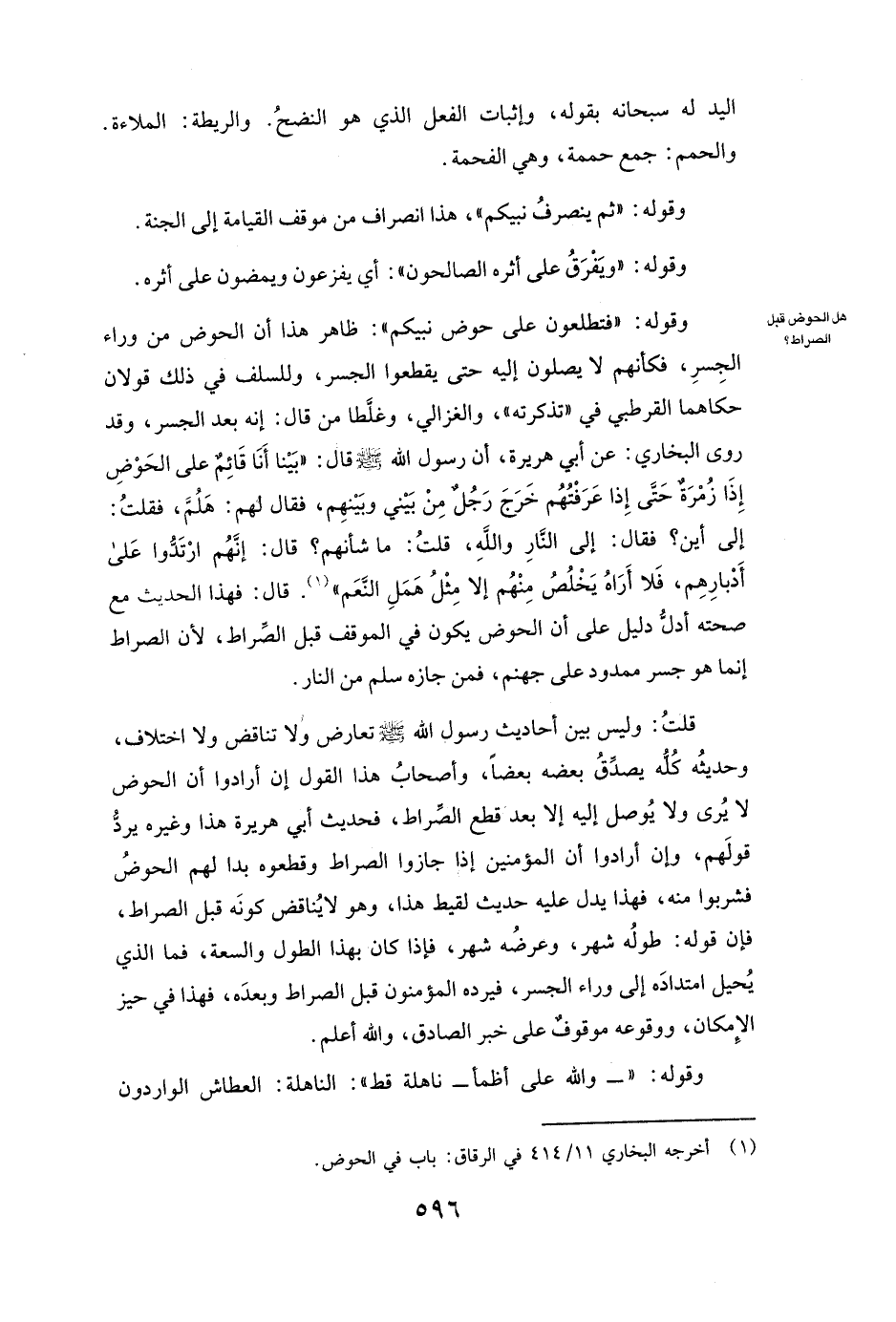 قَالَ: فَهَذَا الْحَدِيثُ مَعَ صِحِّتِهِ أَدَلُّ دَلِيلٍ عَلَى أَنَّ الْحَوْضَ يَكُونُ فِي الْمَوْقِفِ قَبْلَ الصِّرَاطِ؛ لِأَنَّ الصِّرَاطَ إِنَّمَا هُوَ جِسْرٌ مَمْدُودٌ عَلَى جَهَنَّمَ، فَمَنْ جَازَهُ سَلِمَ مِنَ النَّارِ.