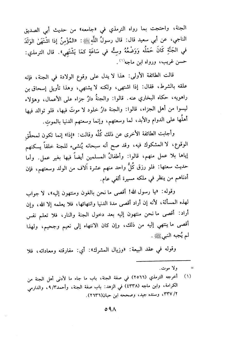 قَالَتِ الطَّائِفَةُ الْأُولَى: هَذَا لَا يَدُلُّ عَلَى وُقُوعِ الْوِلَادَةِ فِي الْجَنَّةِ فَإِنَّهُ عَلَّقَهُ بِالشَّرْطِ، فَقَالَ: إِذَا اشْتَهَى وَلَكِنَّهُ لَا يَشْتَهِي، وَهَذَا تَأْوِيلُ إِسْحَاقَ بْنِ رَاهَوَيْهِ حَكَاهُ الْبُخَارِيُّ عَنْهُ. قَالُوا: وَالْجَنَّةُ دَارُ جَزَاءٍ عَلَى الْأَعْمَالِ، وَهَؤُلَاءِ لَيْسُوا مَنْ أَهْلِ الْجَزَاءِ، قَالُوا: وَالْجَنَّةُ دَارُ خُلُودٍ لَا مَوْتَ فِيهَا، فَلَوْ تَوَالَدَ فِيهَا أَهْلُهَا عَلَى الدَّوَامِ وَالْأَبَدِ لَمَا وَسِعَتْهُمْ، وَإِنَّمَا وَسِعَتْهُمُ الدُّنْيَا بِالْمَوْتِ.