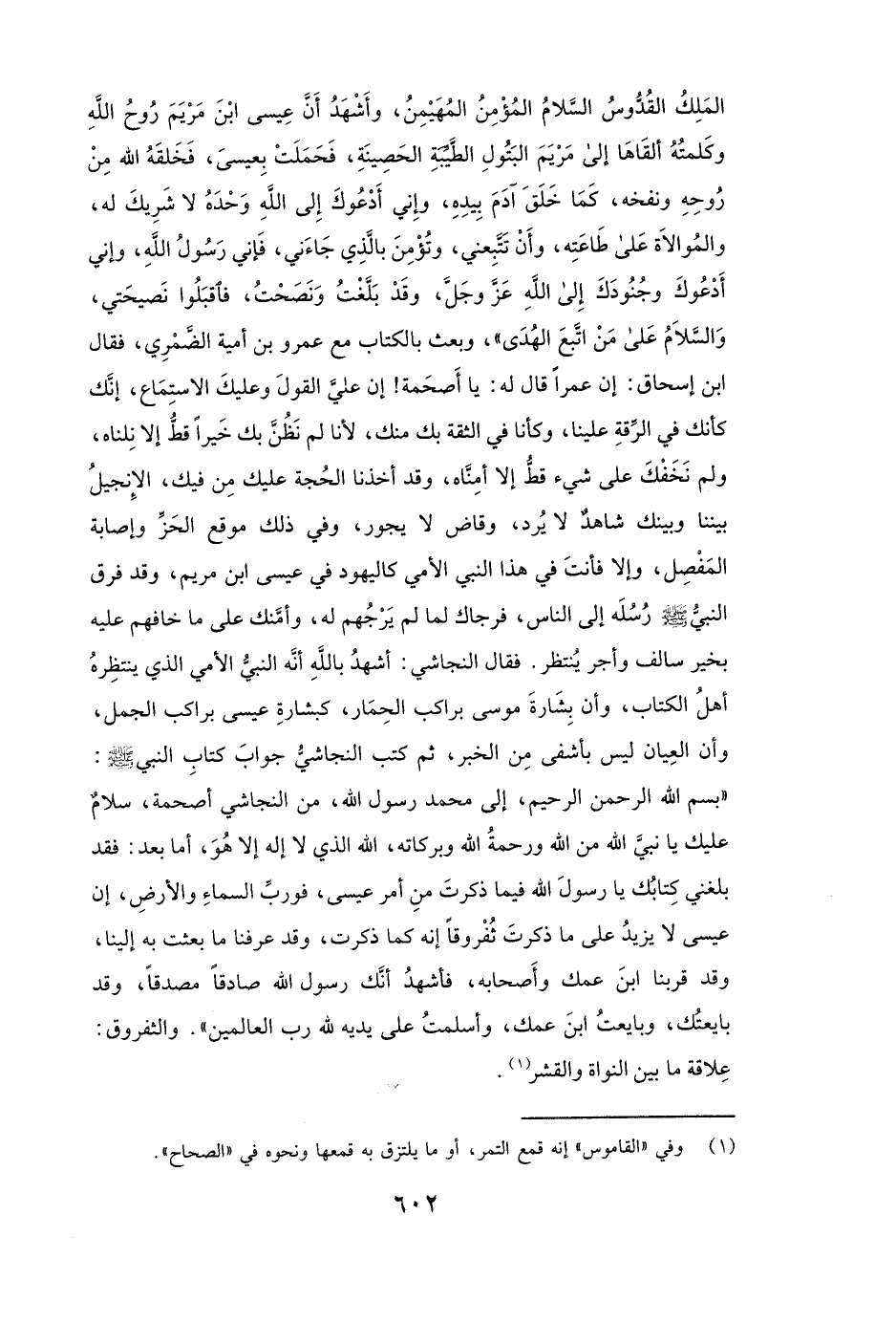 الْمَلِكُ الْقُدُّوسُ السَّلَامُ الْمُؤْمِنُ الْمُهَيْمِنُ، وَأَشْهَدُ أَنَّ عِيسَى ابْنَ مَرْيَمَ رُوحُ اللَّهِ وَكَلِمَتُهُ أَلْقَاهَا إِلَى مريم الْبَتُولِ الطَّيِّبَةِ الْحَصِينَةِ، فَحَمَلَتْ بِعِيسَى فَخَلَقَهُ اللَّهُ مِنْ رُوحِهِ وَنَفَخَهُ، كَمَا خَلَقَ آدَمَ بِيَدِهِ، وَإِنِّي أَدْعُوكَ إِلَى اللَّهِ وَحْدَهُ لَا شَرِيكَ لَهُ، وَالْمُوَالَاةِ عَلَى طَاعَتِهِ، وَأَنْ تَتْبَعَنِي وَتُؤْمِنَ بِالَّذِي جَاءَنِي، فَإِنِّي رَسُولُ اللَّهِ وَإِنِّي أَدْعُوكَ وَجُنُودَكَ إِلَى اللَّهِ عَزَّ وَجَلَّ، وَقَدْ بَلَّغْتُ وَنَصَحْتُ فَاقْبَلُوا نَصِيحَتِي، وَالسَّلَامُ عَلَى مَنِ اتَّبَعَ الْهُدَى» )