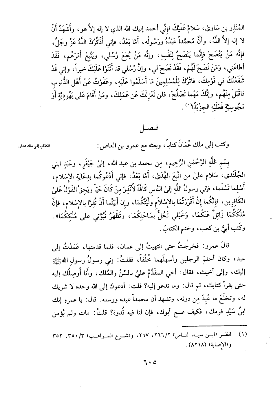 وَكَتَبَ إِلَى مَلِكِ عُمَانَ كِتَابًا وَبَعَثَهُ مَعَ عَمْرِو بْنِ الْعَاصِ: ( «بِسْمِ اللَّهِ الرَّحْمَنِ الرَّحِيمِ مِنْ مُحَمَّدِ بْنِ عَبْدِ اللَّهِ إِلَى جيفر وعبد ابني الجلندى، سَلَامٌ عَلَى مَنِ اتَّبَعَ الْهُدَى، أَمَّا بَعْدُ: فَإِنِّي أَدْعُوكُمَا بِدِعَايَةِ الْإِسْلَامِ أَسْلِمَا تَسْلَمَا، فَإِنِّي رَسُولُ اللَّهِ إِلَى النَّاسِ كَافَّةً؛ لِأُنْذِرَ مَنْ كَانَ حَيًّا وَيَحِقَّ الْقَوْلُ عَلَى الْكَافِرِينَ، فَإِنَّكُمَا إِنْ أَقْرَرْتُمَا بِالْإِسْلَامِ وَلَّيْتُكُمَا، وَإِنْ أَبَيْتُمَا أَنْ تُقِرَّا بِالْإِسْلَامِ، فَإِنَّ مُلْكَكُمَا زَائِلٌ عَنْكُمَا، وَخَيْلِي تَحُلُّ بِسَاحَتِكُمَا، وَتَظْهَرُ نُبُوَّتِي عَلَى مُلْكِكُمَا» ) .