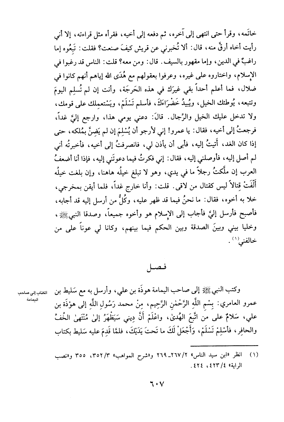 وَكَتَبَ النَّبِيُّ صَلَّى اللَّهُ عَلَيْهِ وَسَلَّمَ إِلَى صَاحِبِ الْيَمَامَةِ هوذة بن علي، وَأَرْسَلَ بِهِ مَعَ سليط بن عمرو العامري: ( «بِسْمِ اللَّهِ الرَّحْمَنِ الرَّحِيمِ مِنْ مُحَمَّدٍ رَسُولِ اللَّهِ إِلَى هوذة بن علي، سَلَامٌ عَلَى مَنِ اتَّبَعَ الْهُدَى، وَاعْلَمْ أَنَّ دِينِي سَيَظْهَرُ إِلَى مُنْتَهَى الْخُفِّ وَالْحَافِرِ، فَأَسْلِمْ تَسْلَمْ، وَأَجْعَلْ لَكَ مَا تَحْتَ يَدَيْكَ» ) فَلَمَّا قَدِمَ عَلَيْهِ سليط بِكِتَابِ