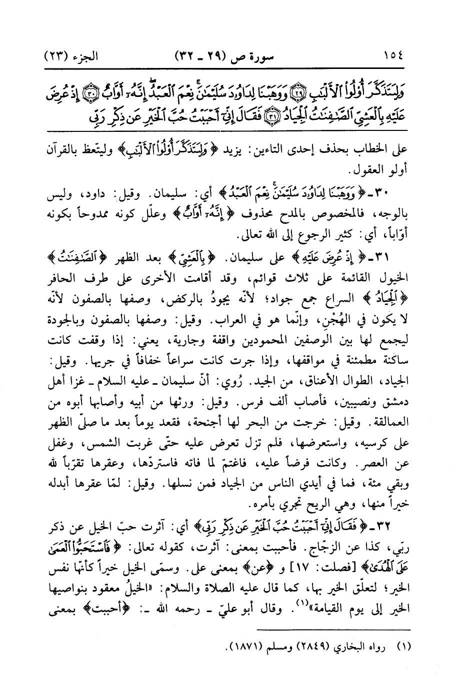 فَقَالَ إِنِّي أَحْبَبْتُ حُبَّ الْخَيْرِ عَنْ ذِكْرِ رَبِّي حَتَّى تَوَارَتْ بِالْحِجَابِ (32)