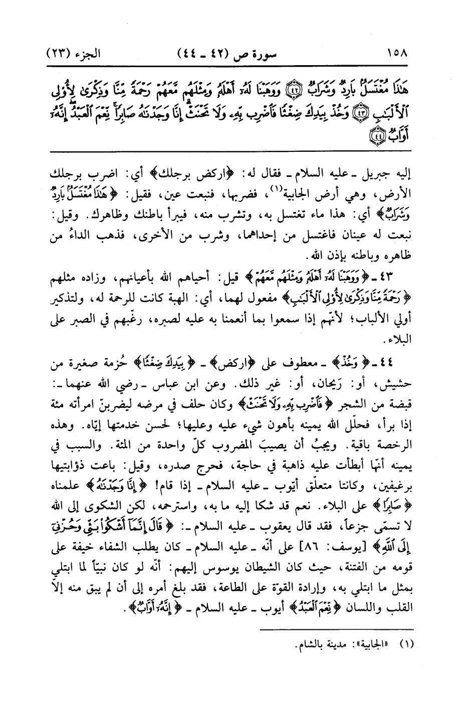 {وَخُذْ} معطوف على اركض {بِيَدِكَ ضِغْثاً} حزمة صغيرة من حشيش أو ريحان أو غير ذلك وعن ابن عباس رضى الله عنهما قبضة من الشجر {فاضرب بِهِ وَلاَ تَحْنَثْ} وكان حلف في مرضه ليضربن امرأته مائة إذا برأ فحلل الله يمينه بأهون شيء عليه وعليها لحسن خدمتها إياه وهذه الرخصة باقية ويجب أن يصيب المضروب كل واحدة من المائة والسبب في يمينه أنها أبطأت عليه ذاهبة فى حاجة فخرج صدره وقيل باعت ذؤابتيها برغيفين وكانتا متعلق أيوب عليه السلام إذا قام {إِنَّا وجدناه} علمناه {صَابِراً} على البلاء نعم قد شكا إلى الله مابه واسترحمه لكن الشكوى إلى الله لا تسمى جزعاً فقد قال يعقوب عليه السلام إِنَّمَا أشكو بني وحزنى إلى الله على أنه عليه السلام كان يطلب الشفاء خيفة على قومه من الفتنة حيث كان الشيطان يوسوس إليهم أنه لو كان نبياً لما ابتلي بمثل ما ابتلي به وإرادة القوة على الطاعة فقد بلغ أمره إلى أن لم يبق منه إلا القلب واللسان {نِعْمَ العبد} أيوب {إِنَّهُ أَوَّابٌ}