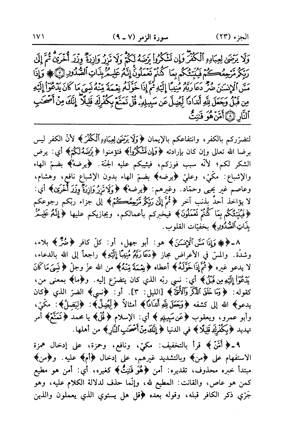 لتضرركم بالكفر وانتفاعكم بالإيمان {وَلاَ يرضى لِعِبَادِهِ الكفر} لأن الكفر ليس برضا الله تعالى وإن كان بإرادته {وَإِن تَشْكُرُواْ} فتؤمنوا {يَرْضَهُ لَكُمْ} أي يرض الشكر لكم لأنه سبب فوزكم فيثيبكم عليه الجنة يرضه بضم الهاء والإشباع مكي وعلي يرضه بضم الهاء بدون الإشباع نافع وهشام وعاصم غير يحيى وحماد وغيرهم يرضه {وَلاَ تَزِرُ وَازِرَةٌ وِزْرَ أخرى} أي لا يؤاخذ أحد بذنب آخر {ثُمَّ إلى رَبِّكُمْ مَّرْجِعُكُمْ} إلى جزاء ربكم رجوعكم {فَيُنَبّئُكُمْ بِمَا كُنْتُمْ تَعْمَلُونَ} فيخبركم بأعمالكم ويجازيكم عليها {إِنَّهُ عَلِيمٌ بِذَاتِ الصدور} بخفيات القلوب