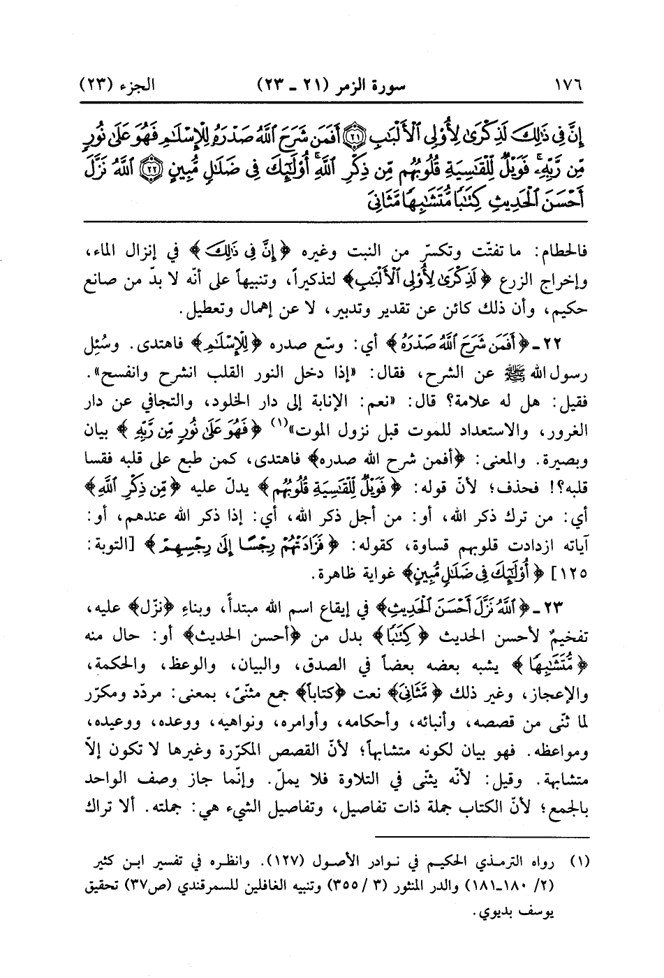 اللَّهُ نَزَّلَ أَحْسَنَ الْحَدِيثِ كِتَابًا مُتَشَابِهًا مَثَانِيَ تَقْشَعِرُّ مِنْهُ جُلُودُ الَّذِينَ يَخْشَوْنَ رَبَّهُمْ ثُمَّ تَلِينُ جُلُودُهُمْ وَقُلُوبُهُمْ إِلَى ذِكْرِ اللَّهِ ذَلِكَ هُدَى اللَّهِ يَهْدِي بِهِ مَنْ يَشَاءُ وَمَنْ يُضْلِلِ اللَّهُ فَمَا لَهُ مِنْ هَادٍ (23)