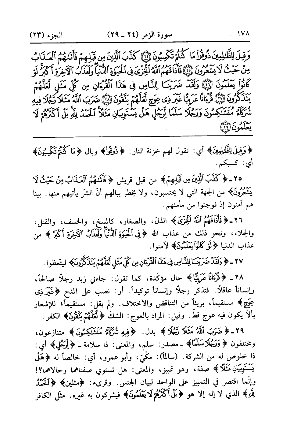 ضَرَبَ اللَّهُ مَثَلًا رَجُلًا فِيهِ شُرَكَاءُ مُتَشَاكِسُونَ وَرَجُلًا سَلَمًا لِرَجُلٍ هَلْ يَسْتَوِيَانِ مَثَلًا الْحَمْدُ لِلَّهِ بَلْ أَكْثَرُهُمْ لَا يَعْلَمُونَ (29)