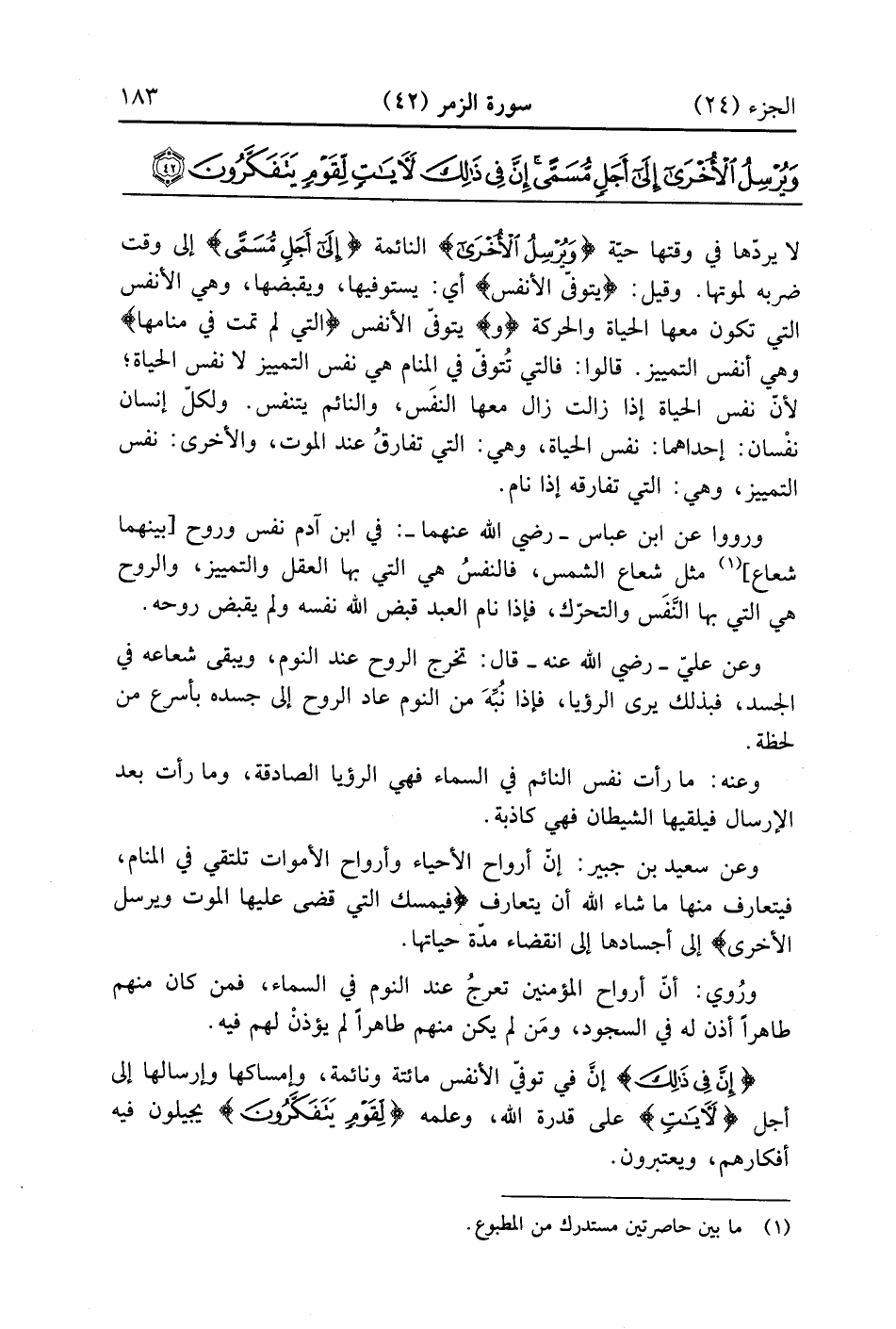 لا يردها في وقتها حية ( {وَيُرْسِلُ الأخرى} النائمة {إلى أَجَلٍ مُّسَمًّى} إلى وقت ضربه لموتها وقيل يتوفى الأنفس أي يستوفيها ويقبضها وهي الأنفس التي تكون معها الحياة والحركة ويتوفى الأنفس التي لم تمت في منامها وهي أنفس التمييز قالوا التي تتوفى في المنام هي نفس التمييز لا نفس الحياة لأن نفس الحياة إذا زالت زال معها النفسَ والنائم يتنفس ولكل إنسان نفسا إحداهما نفس الحياة وهي التي تفارق عند الموت والأخرى نفس التمييز وهي التي تفارقه إذا نام ورُوي عن ابن عباس رضى الله عنهما في ابن آدم نفس روح بينهما شعاع مثل شعاع الشمس فالنفس هي التي بها العقل والتمييز والروح هي التي بها النفس والتحرك فاذا انام العبد قبض الله نفسه ولم يقبض روحه وعن علي رضي الله عنه قال تخرج الروح عند النوم ويبقى شعاعها في الجسد فبذلك يرى الرؤيا فإذا انتبه من النوم عاد الروح إلى جسده بأسرع من لحظة وعنه ما رأت نفس النائم في السماء فهي الرؤيا الصادقة وما رأت بعد الإرسال فيلقنها الشيطان فهي كاذبة وعن سعيد بن جبير أن أرواح الأحياء وأرواح الأموات تلتقي