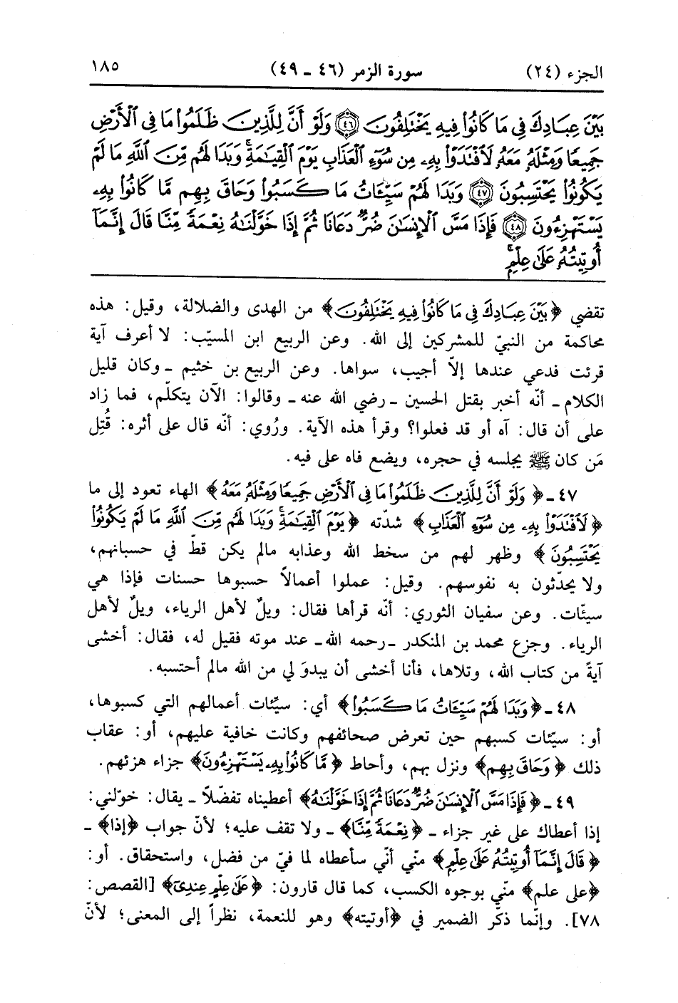 {وَلَوْ أَنَّ لِلَّذِينَ ظَلَمُواْ مَا فِى الأرض جَمِيعاً وَمِثْلَهُ مَعَهُ} الهاء تعود إلى ما {لاَفْتَدَوْاْ بِهِ مِن سُوءِ العذاب} شدته {يَوْمَ القيامة وَبَدَا لَهُمْ مِّنَ الله مَا لَمْ يَكُونُواْ يَحْتَسِبُونَ} وظهر لهم من سخط الله وعذابه مالم يكن قط في حسبانهم ولا يحدثون به نفوسهم وقيل عملوا أعمالاً حسبوها حسنات فإذا هي سيئات وعن سفيان الثوري أنه قرأها فقال ويل لأهل الرياء ويل لأهل الرياء وجزع محمد بن المنكدر عند موته فقيل له فقال أخشى آية من كتاب الله وتلاها فأنا أخشى أن يبدوا لى من الله مالم أحتسبه