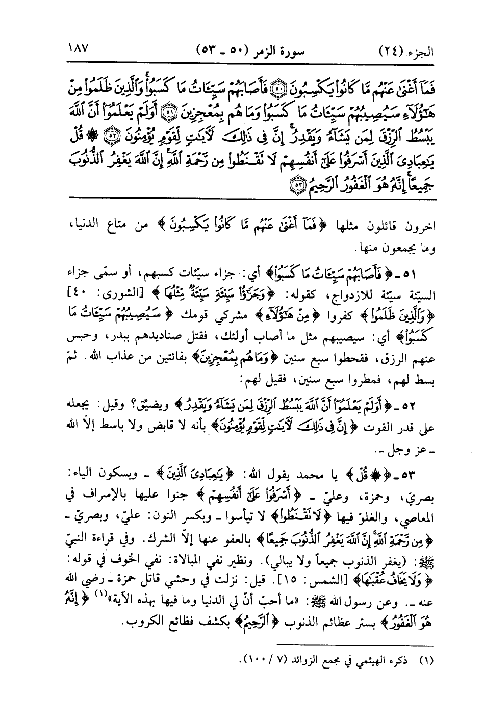 قُلْ يَا عِبَادِيَ الَّذِينَ أَسْرَفُوا عَلَى أَنْفُسِهِمْ لَا تَقْنَطُوا مِنْ رَحْمَةِ اللَّهِ إِنَّ اللَّهَ يَغْفِرُ الذُّنُوبَ جَمِيعًا إِنَّهُ هُوَ الْغَفُورُ الرَّحِيمُ (53)