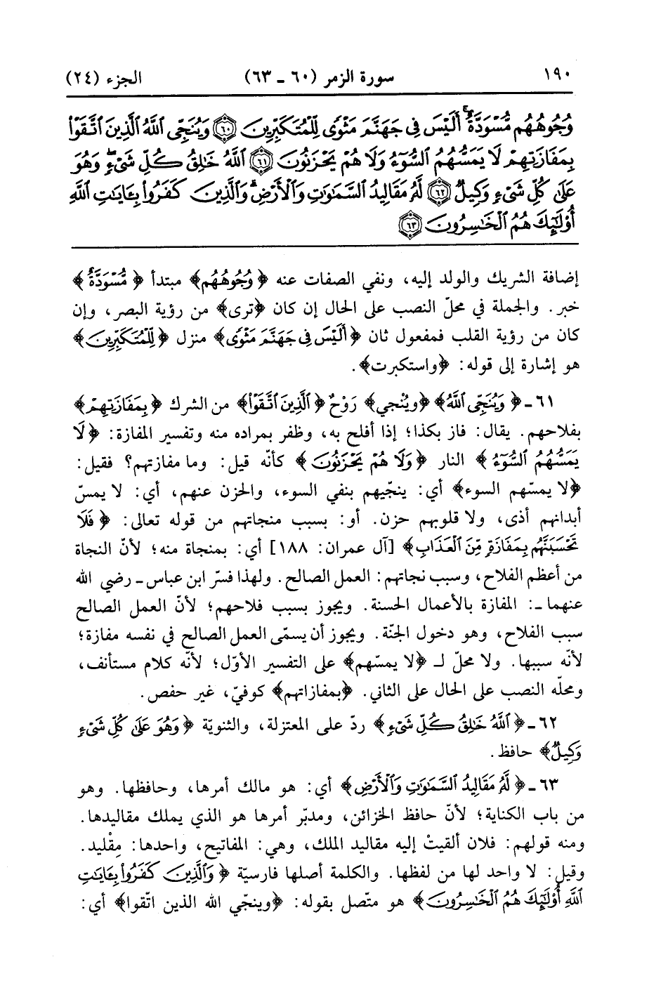{وَيُنَجِّى الله} وَيُنَجّى روح {الذين اتقوا} من الشرك {بِمَفَازَتِهِمْ} بفلاحهم يقال فاز بكذا إذا أفلح به وظفر بمراده منه وتفسير المفازة {لاَ يَمَسُّهُمُ السوء} النار {وَلاَ هُمْ يحزنون} كأنه قيل وما مفازتهم فقيل لا يمسهم السوء أي ينجيهم بنفي السوء والحزن عنهم أي لا يمس أبدانهم أذى ولا قلوبهم خزي أو بسبب منجاتهم من قوله تعالى فلا نحسبنهم بمفازة من العذاب أي بمنجاة منه لأن النجاة من أعظم الفلاح وسبب منجاتهم العمل الصالح ولهذا فسر ابن عباس رضى الله عنهما المفازة بالأعمال الحسنة ويجوز بسبب فلاحهم لأن العمل الصالح سبب الفلاح وهو دخول الجنة ويجوز أن يسمى العمل الصالح في نفسه مفازة لانه سببها ولا محل للايمسهم على التفسير الأول لأنه كلام مستأنف ومحله النصب على الحال على الثاني بمفازاتهم كوفي غير حفص