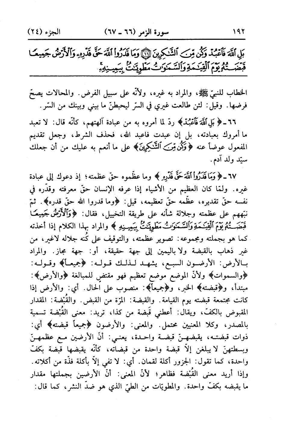 وَمَا قَدَرُوا اللَّهَ حَقَّ قَدْرِهِ وَالْأَرْضُ جَمِيعًا قَبْضَتُهُ يَوْمَ الْقِيَامَةِ وَالسَّمَاوَاتُ مَطْوِيَّاتٌ بِيَمِينِهِ سُبْحَانَهُ وَتَعَالَى عَمَّا يُشْرِكُونَ (67)