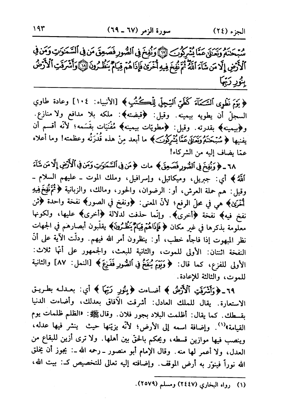 وَأَشْرَقَتِ الْأَرْضُ بِنُورِ رَبِّهَا وَوُضِعَ الْكِتَابُ وَجِيءَ بِالنَّبِيِّينَ وَالشُّهَدَاءِ وَقُضِيَ بَيْنَهُمْ بِالْحَقِّ وَهُمْ لَا يُظْلَمُونَ (69)