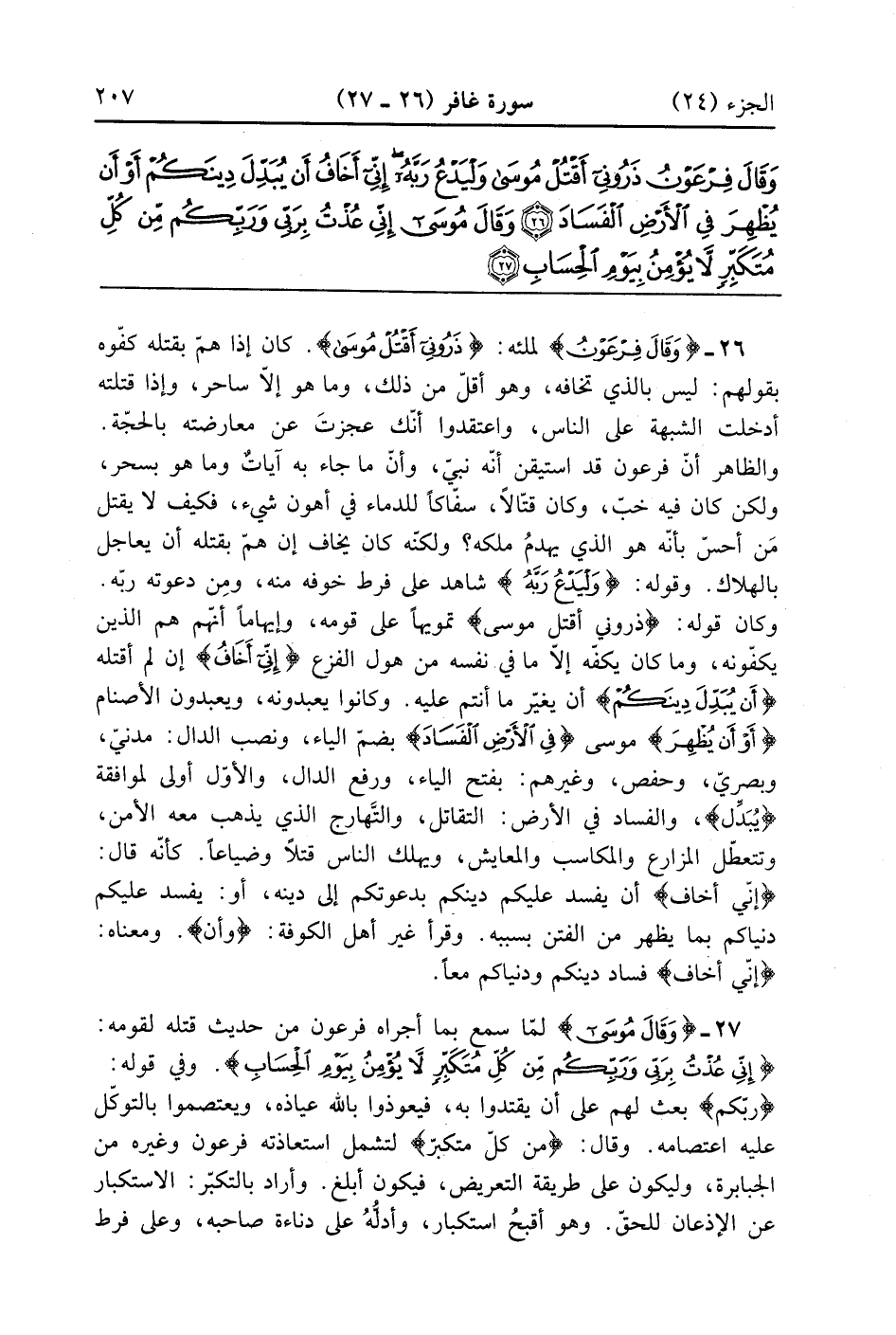 وَقَالَ فِرْعَوْنُ ذَرُونِي أَقْتُلْ مُوسَى وَلْيَدْعُ رَبَّهُ إِنِّي أَخَافُ أَنْ يُبَدِّلَ دِينَكُمْ أَوْ أَنْ يُظْهِرَ فِي الْأَرْضِ الْفَسَادَ (26)